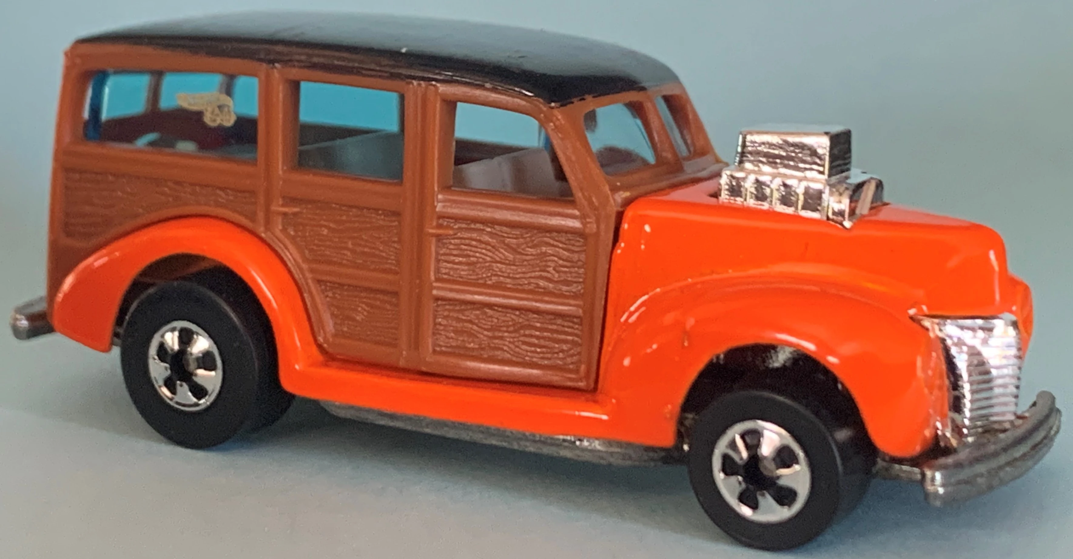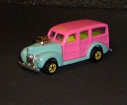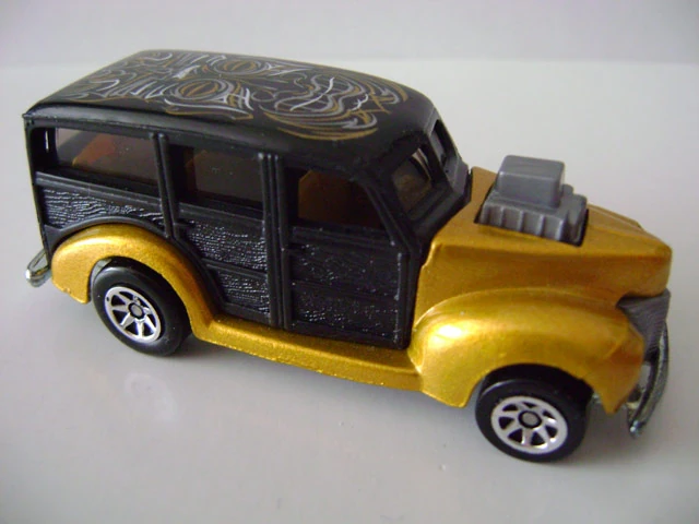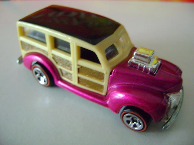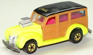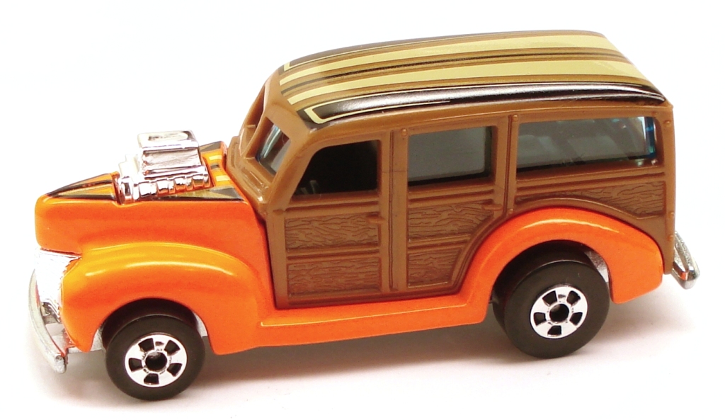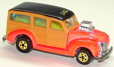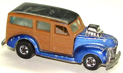This casting was first released into the lineup in 1980 as a "Hi-Raker". This was a special series that allowed the rear axle to change its height when pulled down, changing the angle of how the vehicle sits, giving it a "raked" hot rod appearance. Only the very first release of the '40's Woodie had smooth side panels. All other versions released afterwards have a wood-grain texture to the side panels.
