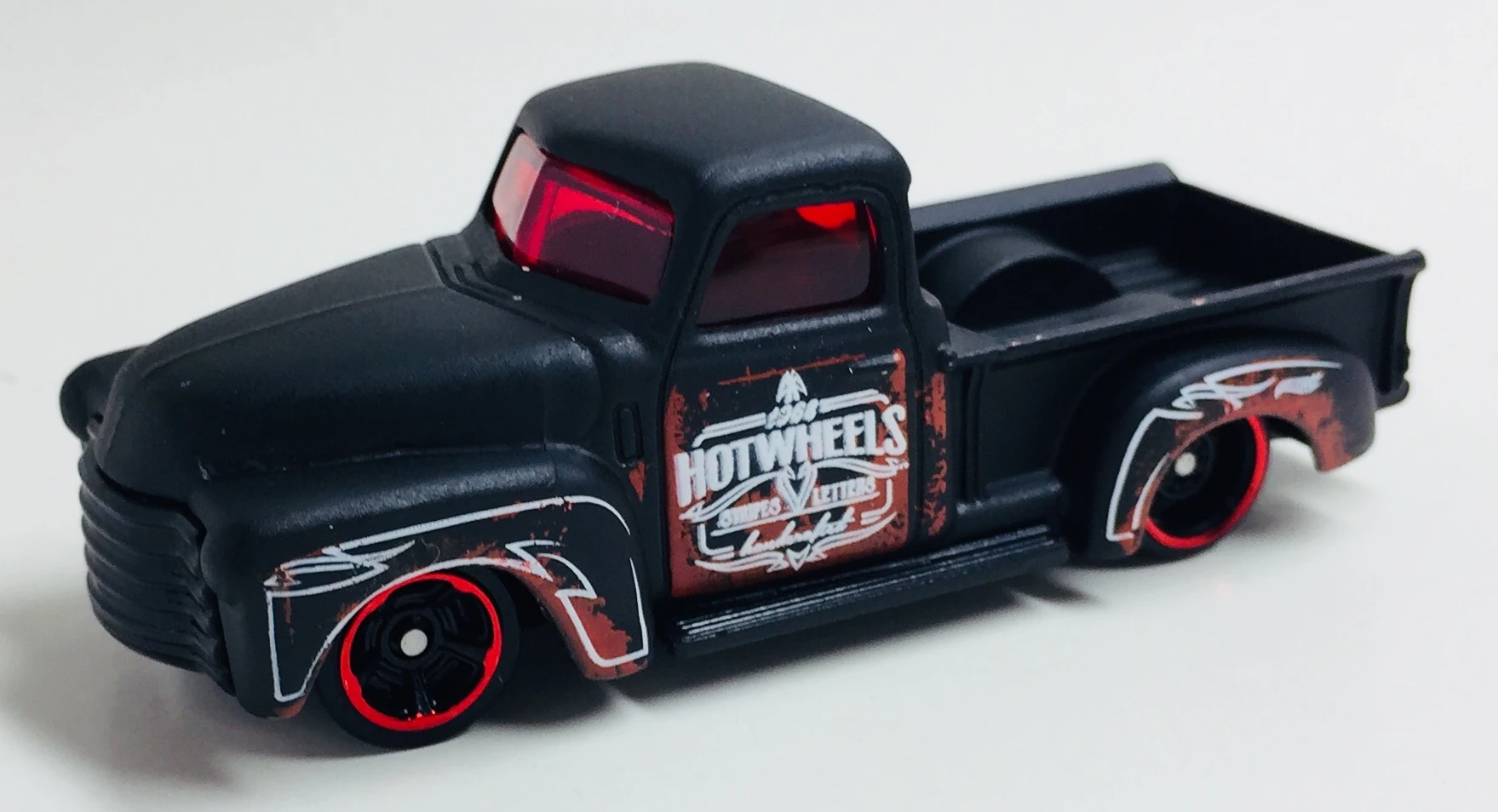 Matte Black | White Pinstripes with Red Undercoat showing through as worn areas. '1968 Hot Wheels Stripes & Letters' on Doors. | Black / Plastic |