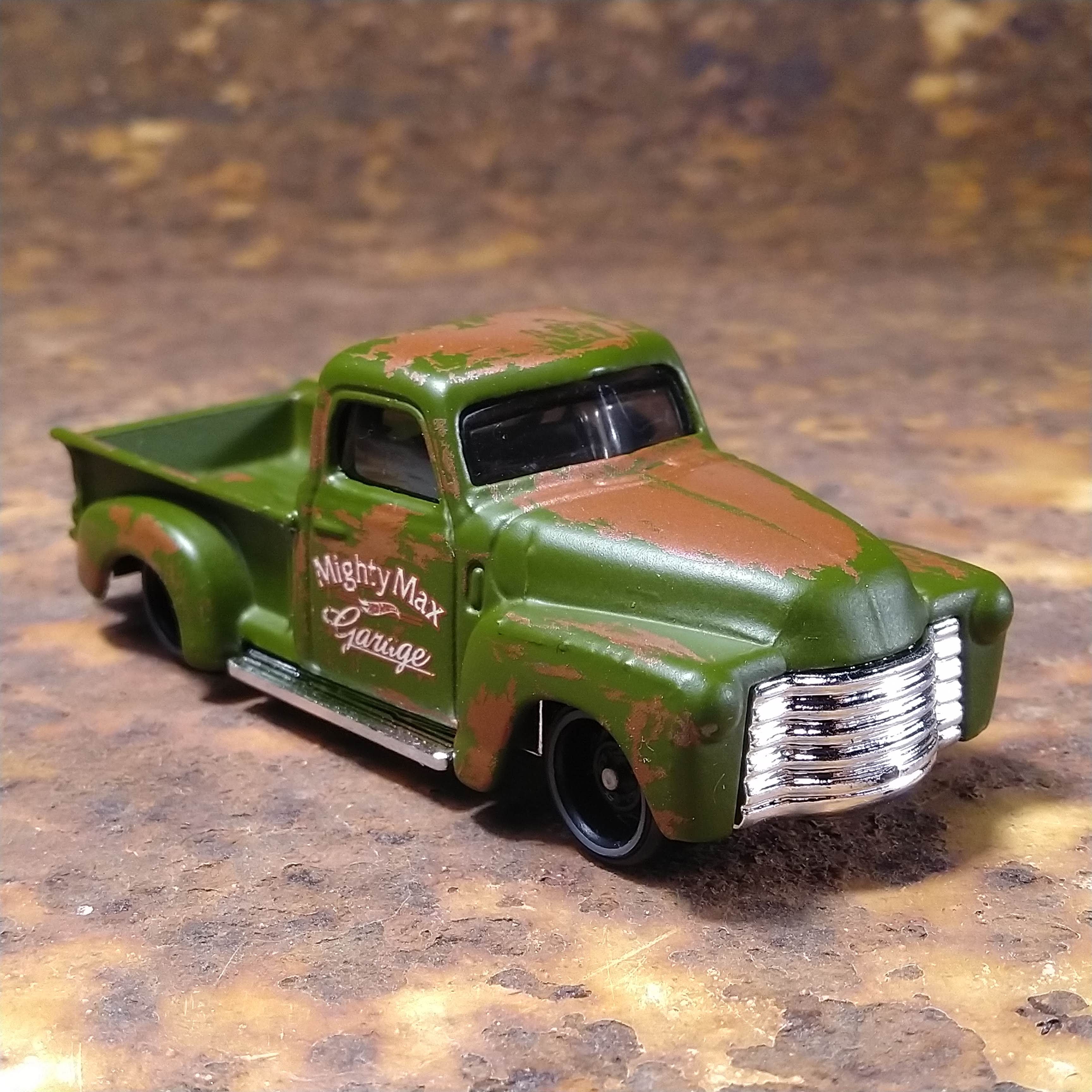 Matte Green | "Mighty Max Garage" & Hot Wheels logo on side doors. 'Rust' randomly on body | Chrome / Plastic |