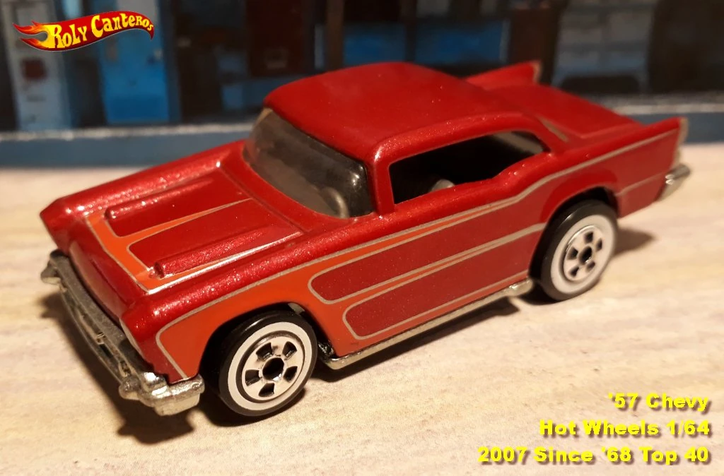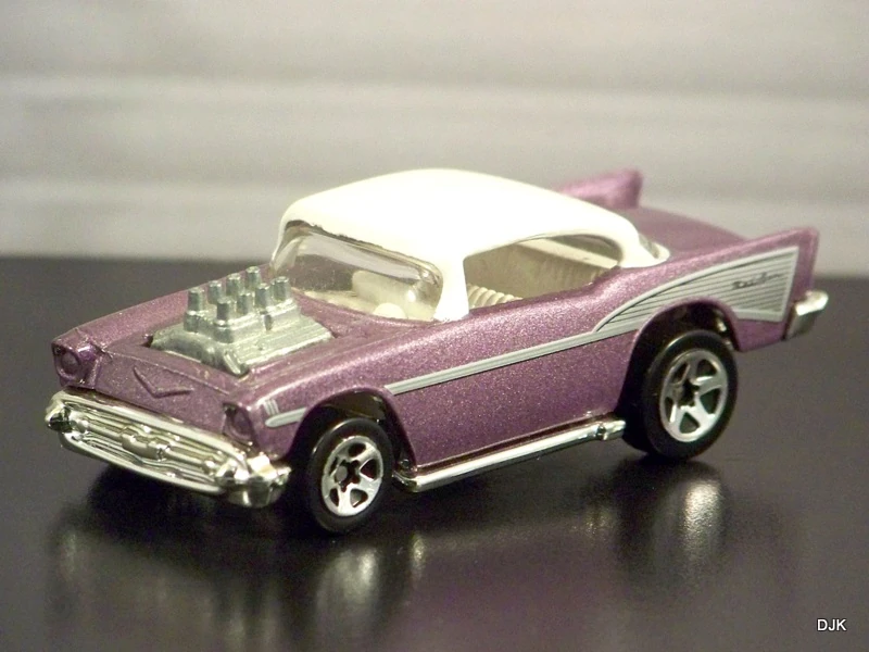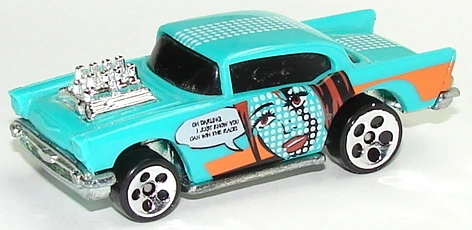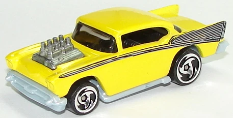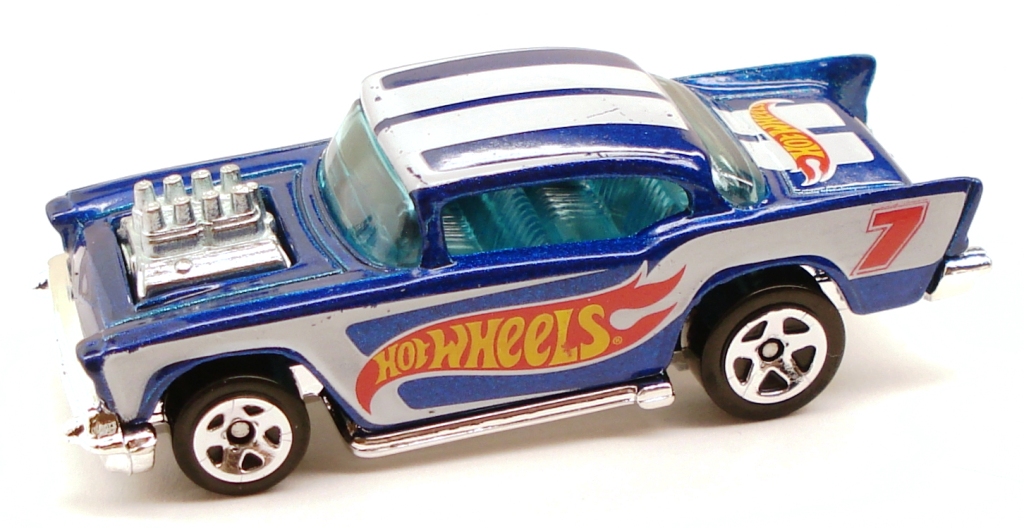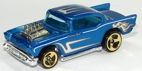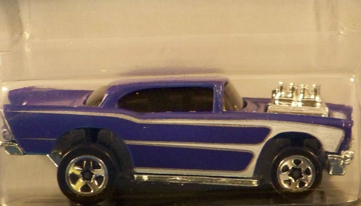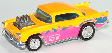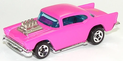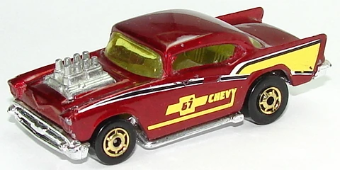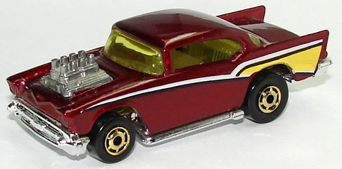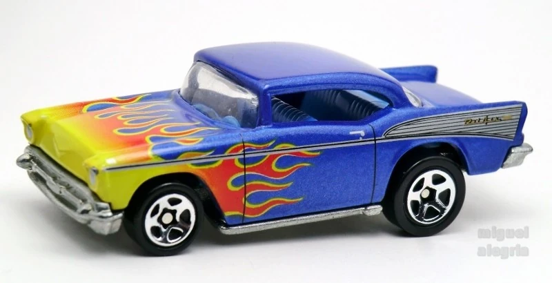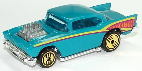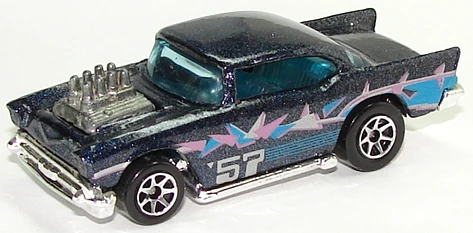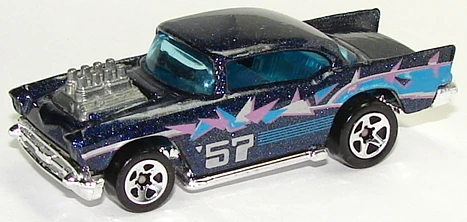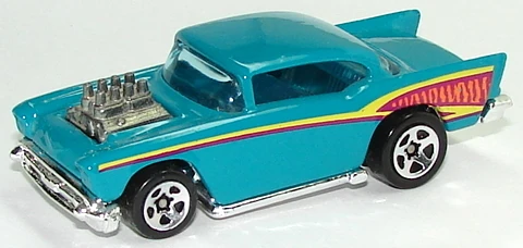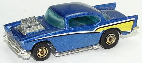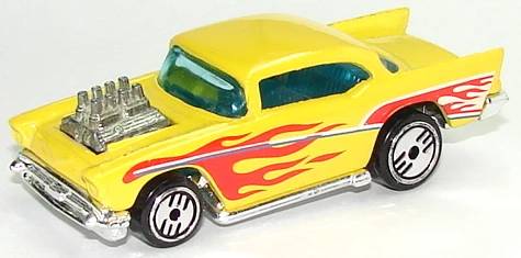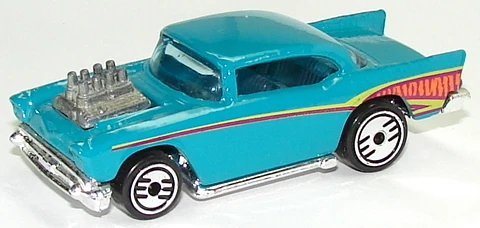 A popular and long running model in largely continuous production since 1977, the '57 Chevy is one of the most frequently collected and popular Hot Wheels models. It is available with both a closed hood and a blown engine and with plastic and metal bases. The casting was retooled in 2018 to make the interior piece separate from the window piece.