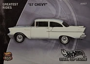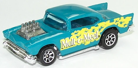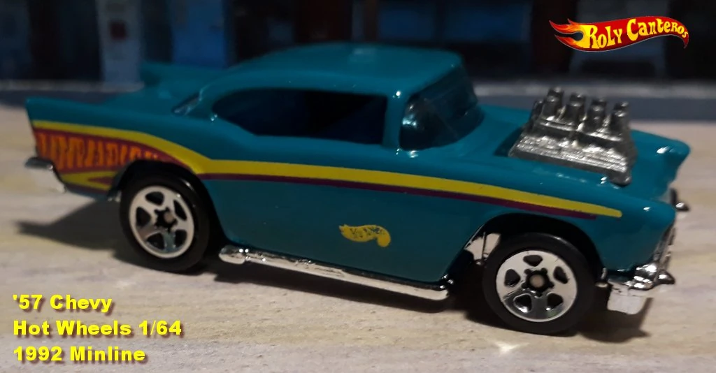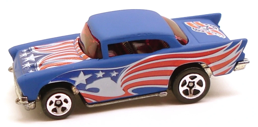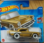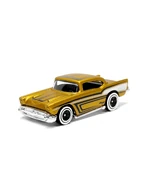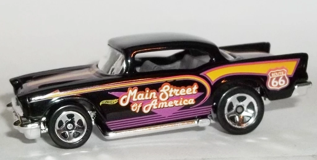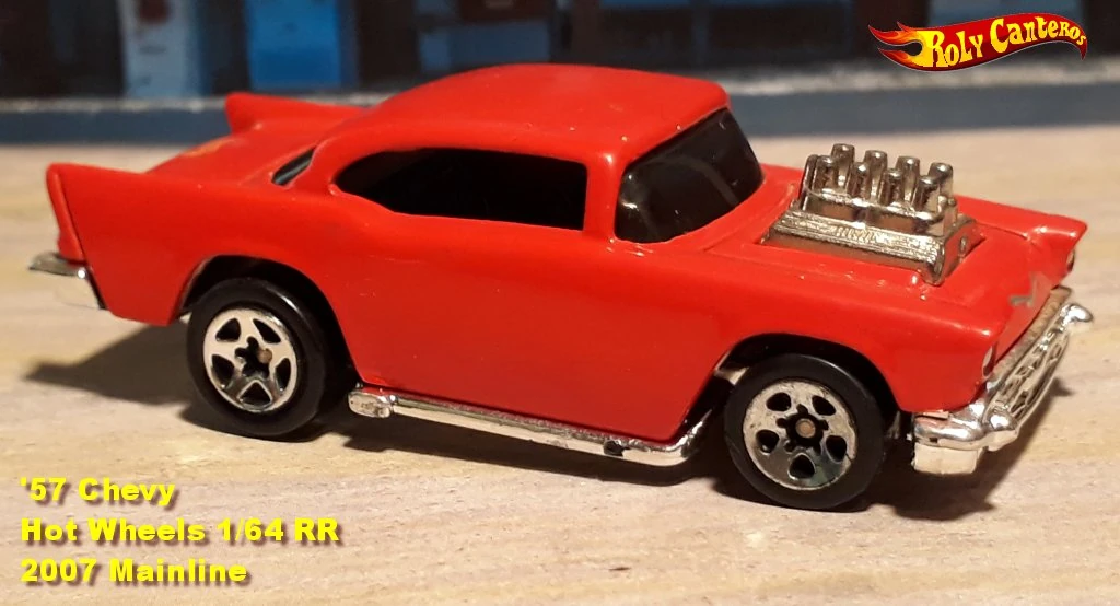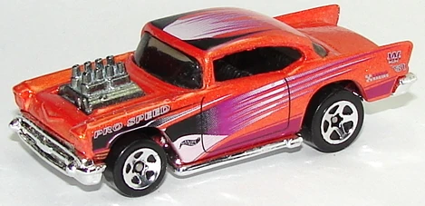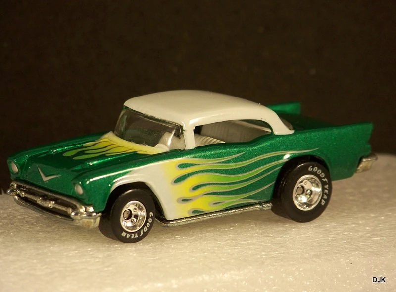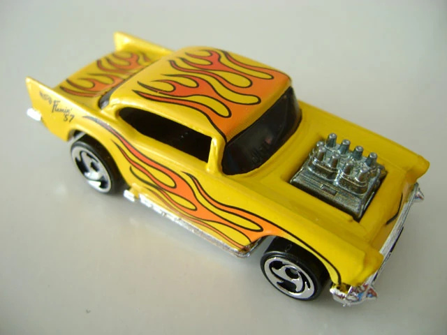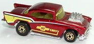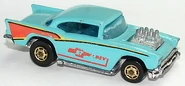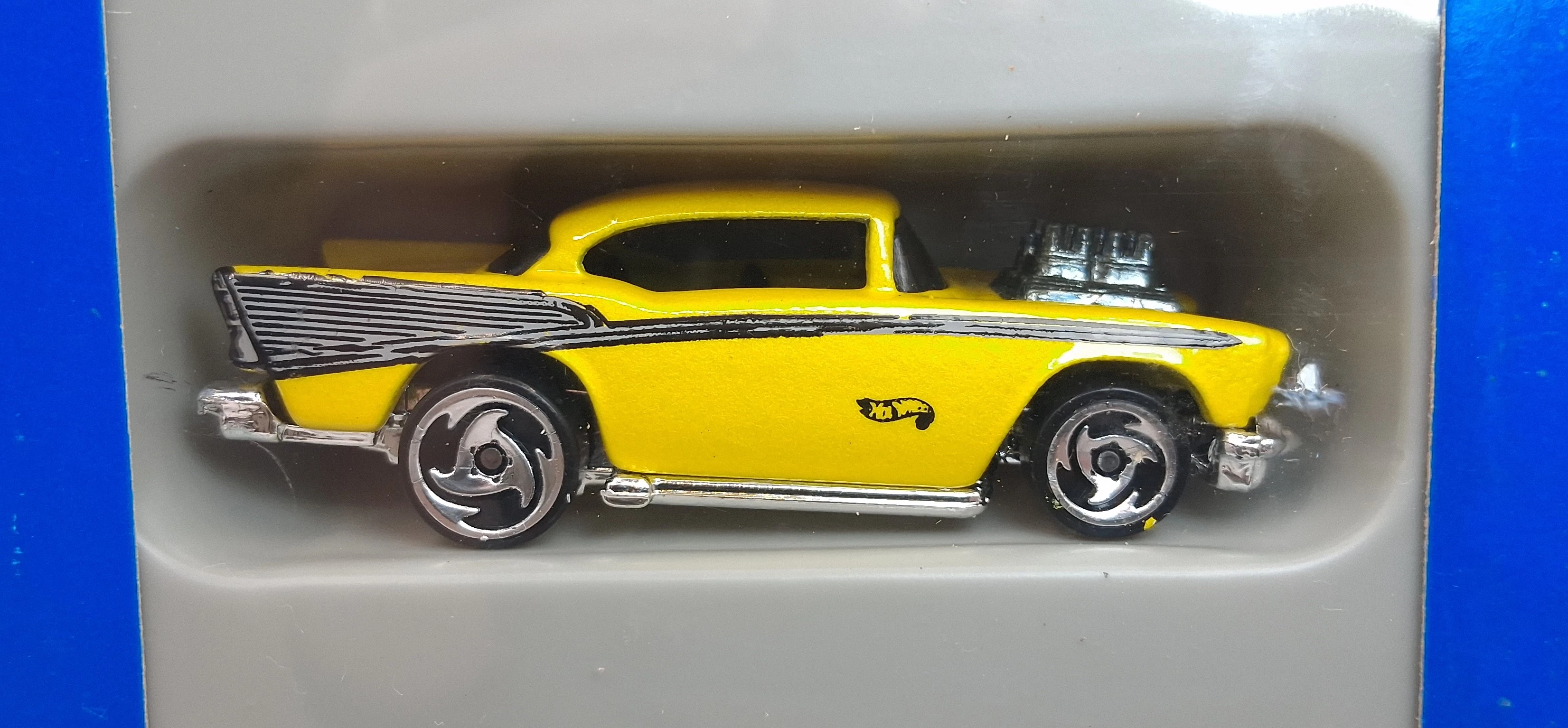A popular and long running model in largely continuous production since 1977, the '57 Chevy is one of the most frequently collected and popular Hot Wheels models. It is available with both a closed hood and a blown engine and with plastic and metal bases. The casting was retooled in 2018 to make the interior piece separate from the window piece.