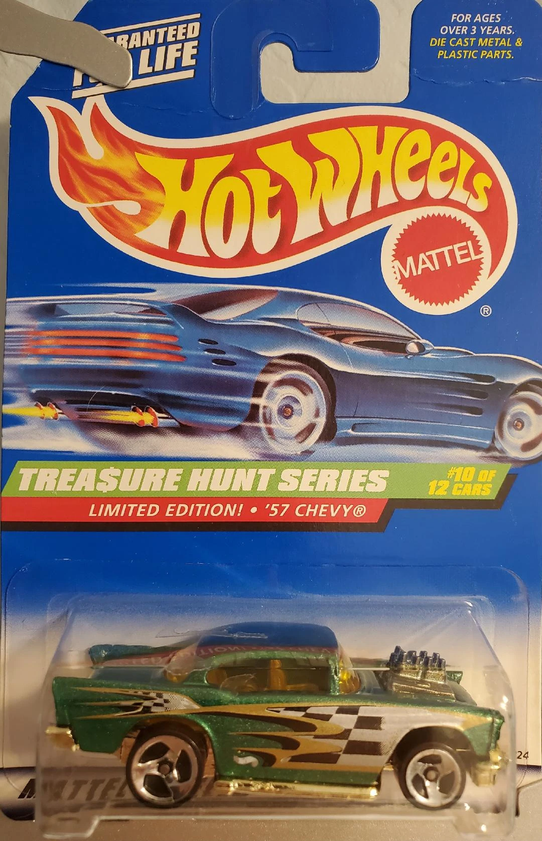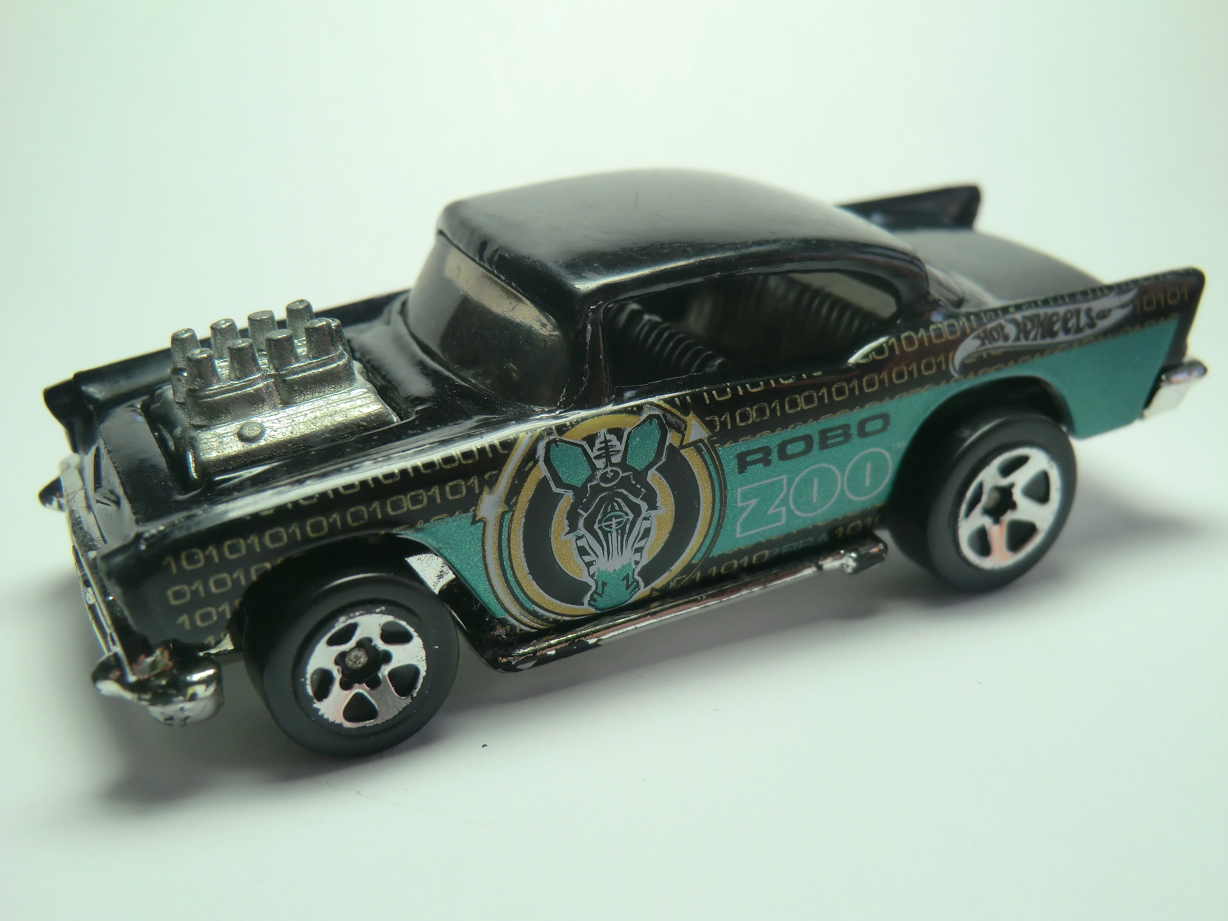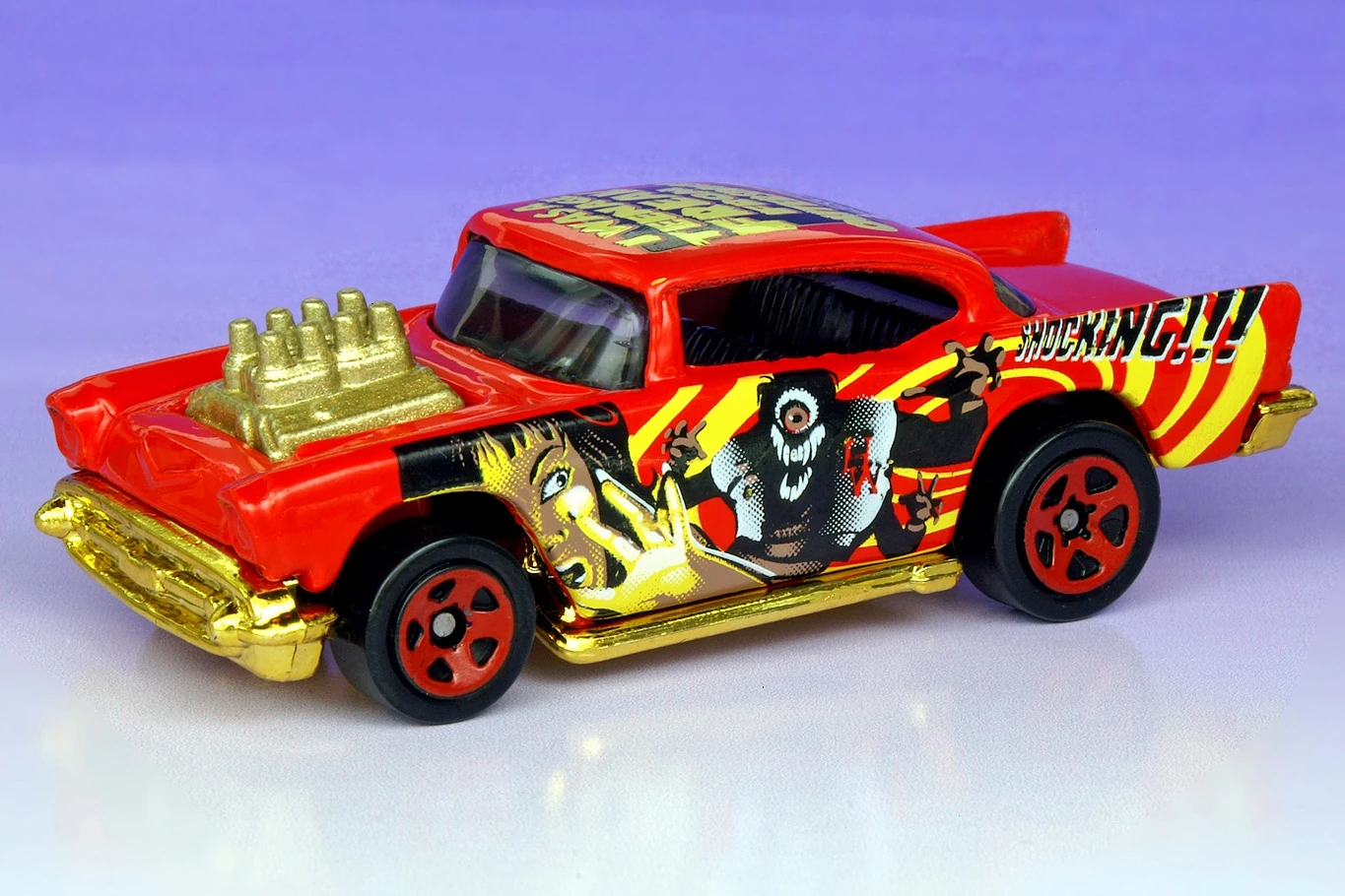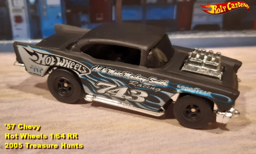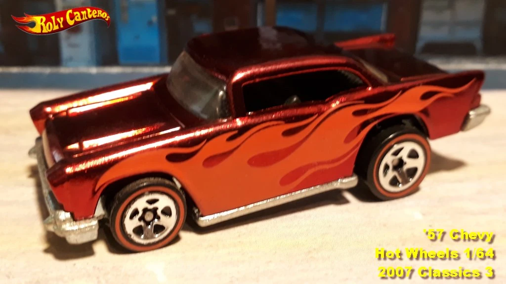 A popular and long running model in largely continuous production since 1977, the '57 Chevy is one of the most frequently collected and popular Hot Wheels models. It is available with both a closed hood and a blown engine and with plastic and metal bases. The casting was retooled in 2018 to make the interior piece separate from the window piece.