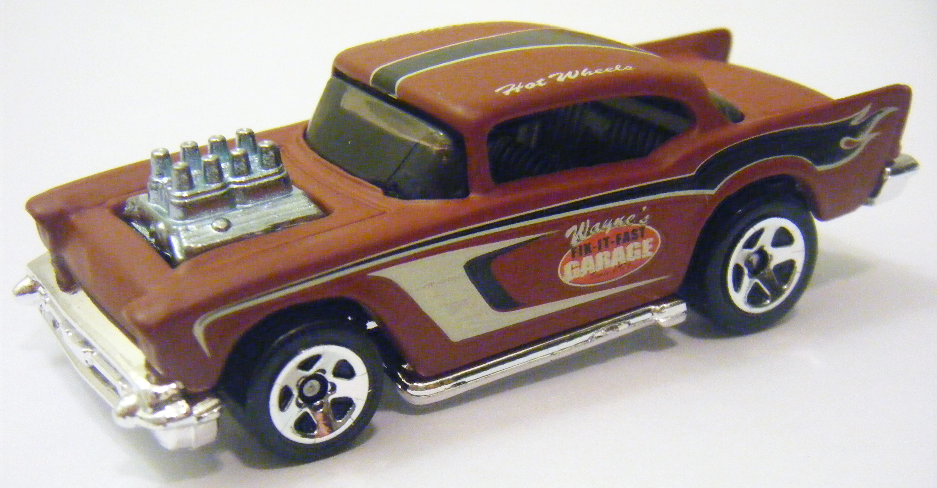| 2009 | 10-Pack Exclusive | Flat Brown | Beige, Black & Red tampos "Wayne's Fix-It-Fast Garage Since 1971" inside of Red Oval, Hot Wheels logo | Chrome / Plastic |