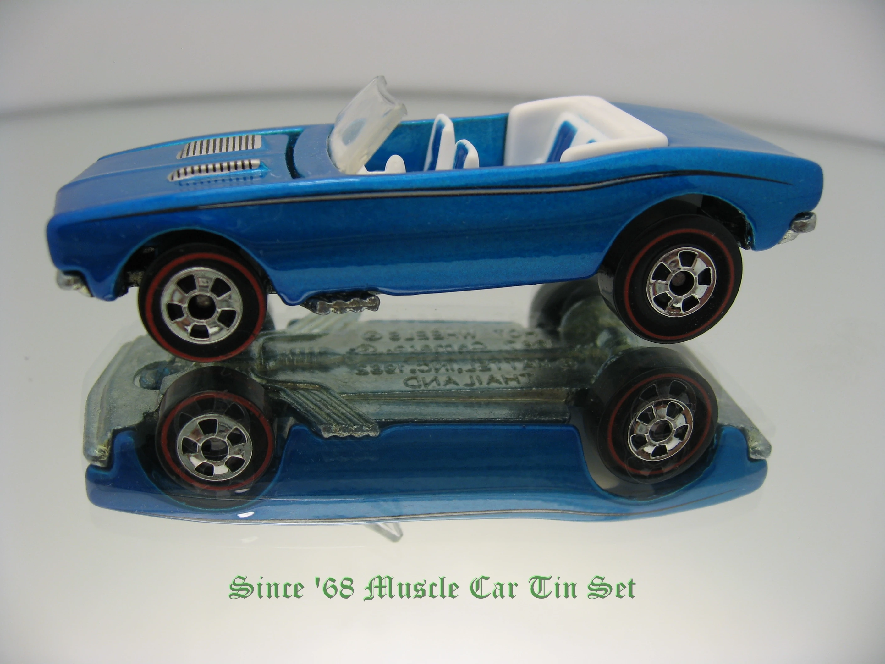 | 2008 | Since '68: Muscle Cars 4-Car Tin Set | Metalflake Blue | Black & Silver pinstripes on sides, Black & Silver vents on hood | ZAMAC | Clear | White with Blue seats | RLBW | M4411 | Thailand |