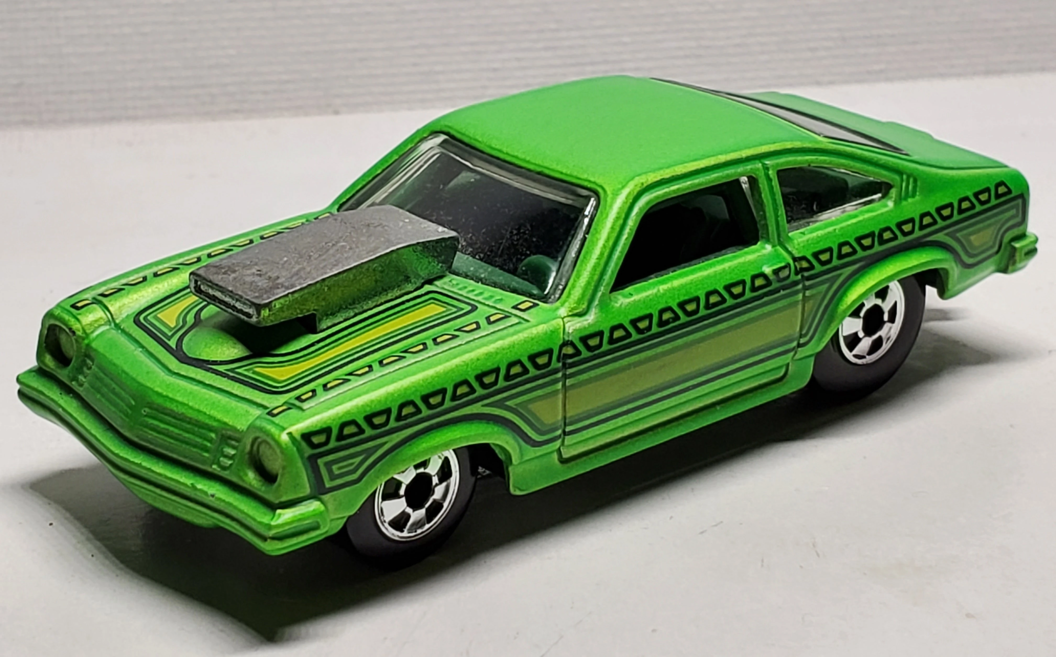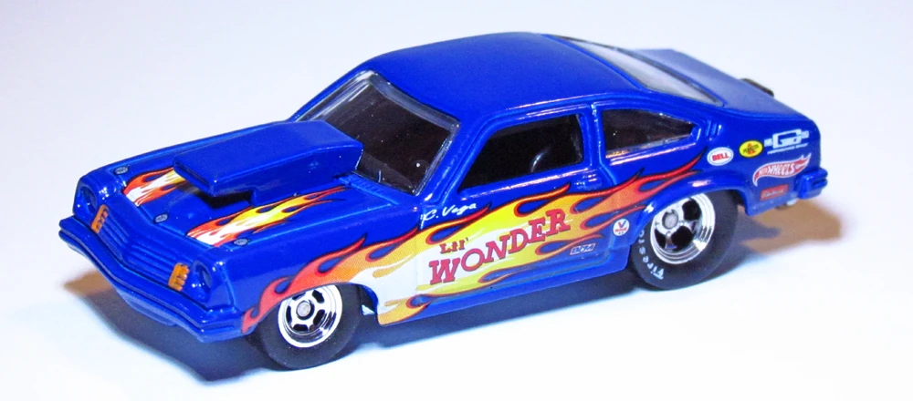 | 2012 | Hot Wheels Racing: NHRA | Blue | Flames, 'Lil Wonder', race deco on sides, flames on hood | ZAMAC | Clear | Black | Drag slick Firestone RRMag | W8311 | Thailand | Named '74 Chevy Vega Pro Stock Base code(s): D48 |