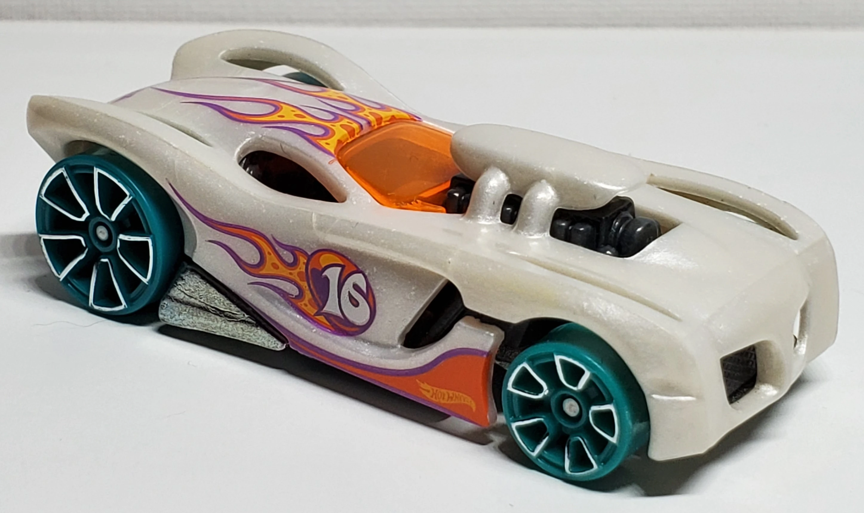 Pearl White | Purple & Orange flames on sides & across top, number 16 & HW logo on sides | Unpainted / Metal |