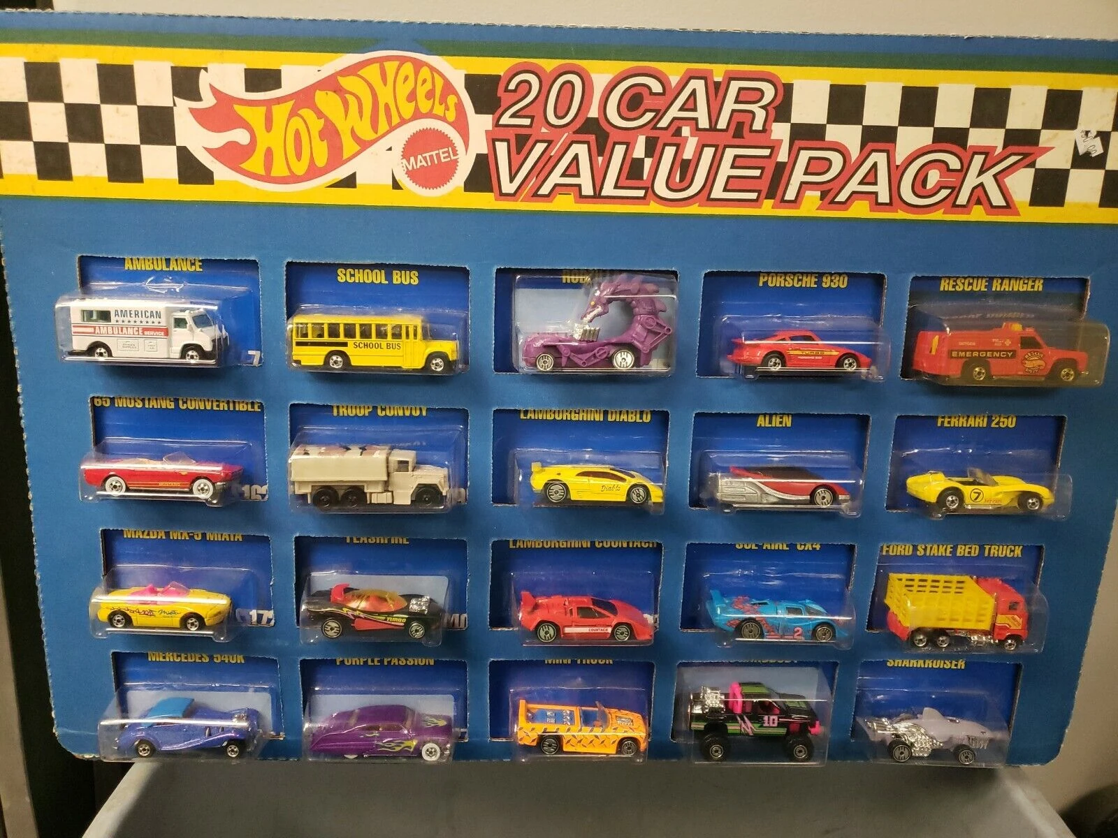 This page will be on the 20-Pack. The First 20-Pack Hot Wheels released were very large( approx. 2 1/2 ' x 1 1/2') flat blue cardboard with windows cut out to fit the blister of each car. 20 Hot Wheels blisterpacks were placed inside and then sealed on the back. This was 1990? maybe 1991. Anyway I remember buying my first one because it had a SHO Mini Truck, so I hunted for more. The one pictured left is 1996.