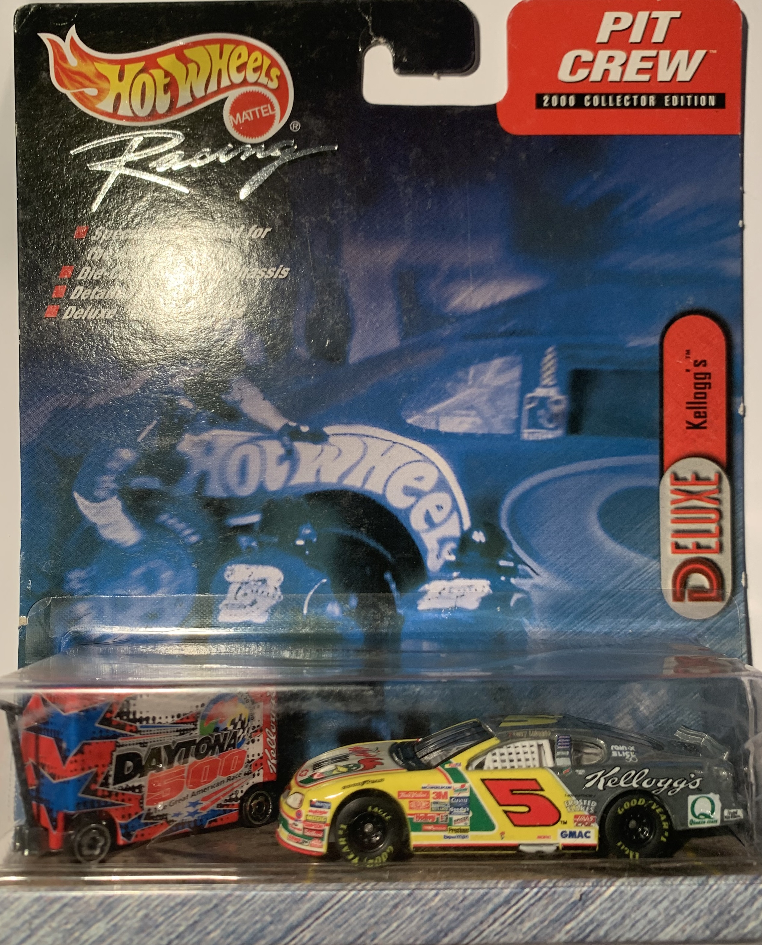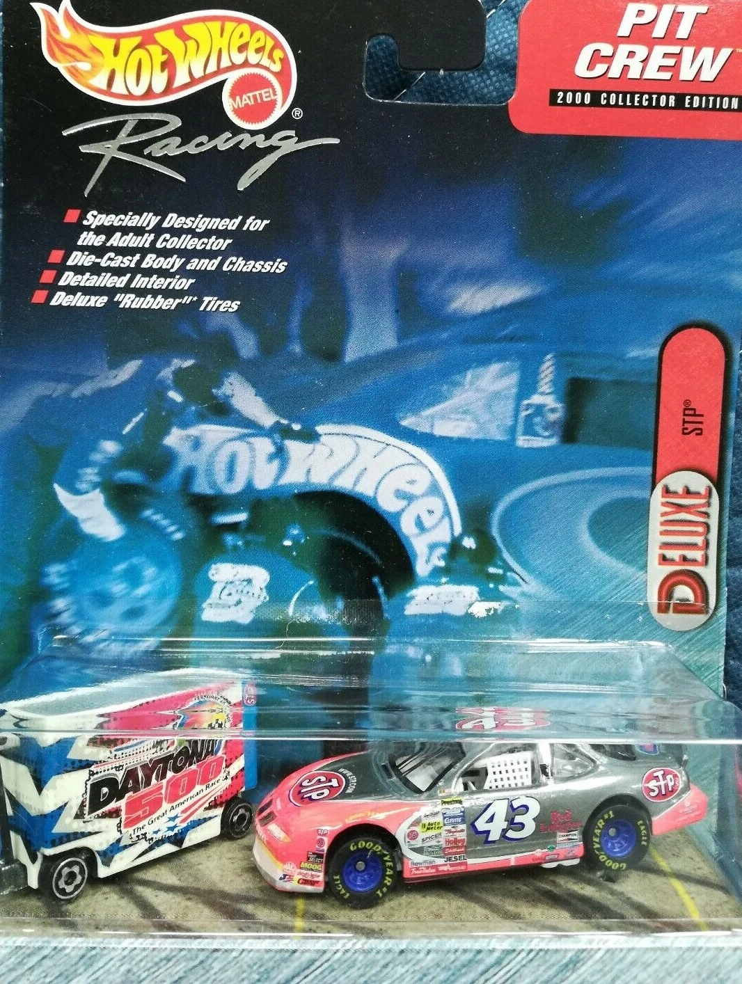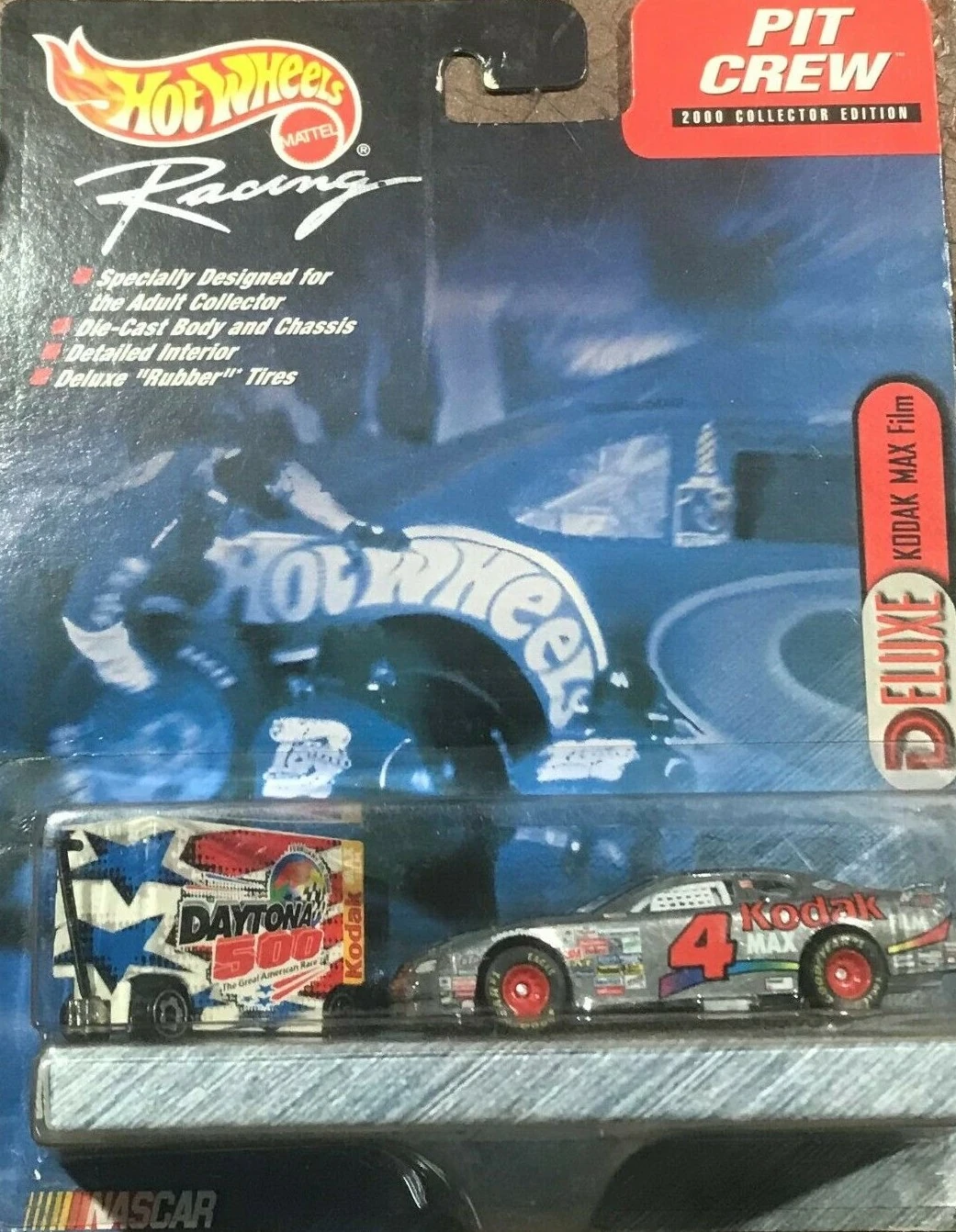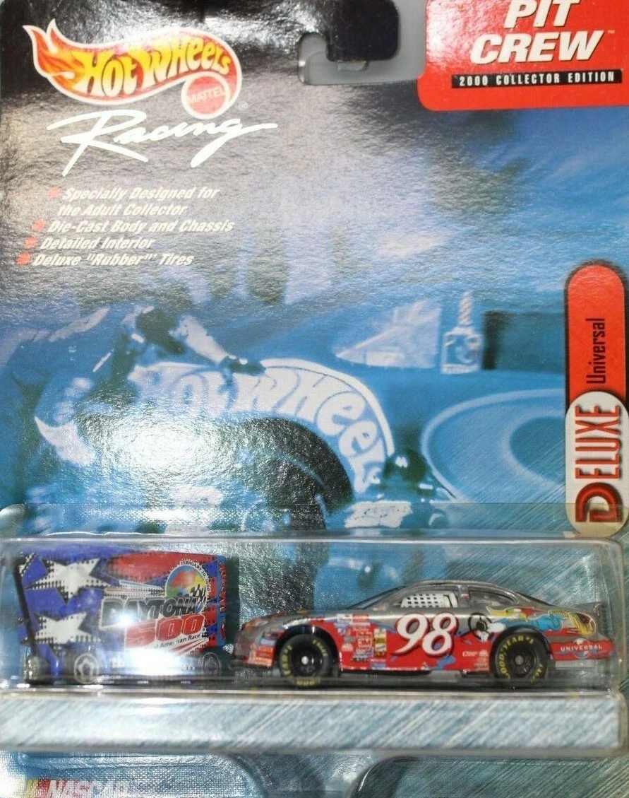 "Hot Wheels Racing celebrates its partnership with the Daytona 500 and the International Speedway Corporation by issuing this exclusive Pit Crew edition, featuring a tool box decorated with special ISC logos and a cool car with the look of stainless steel. It's a great way to commemorate the 2000 NASCAR season, as the nation's fastest growing spectator sport accelerates into the next golden age of racing."