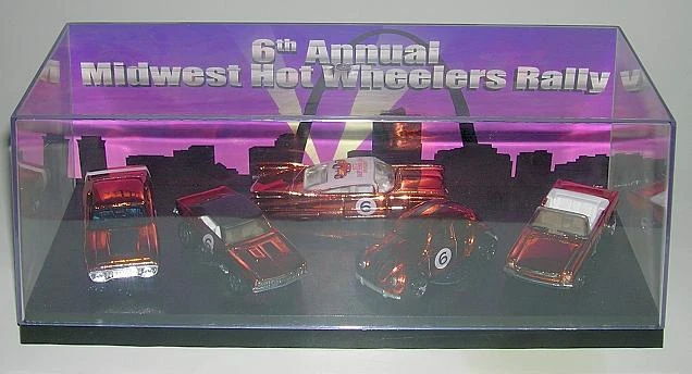 The Gateway Hot Wheelers Club started in 1987. They held their 6th Annual Midwest Hot Wheelers Rally on June 12-14 of 2003, in St. Louis, Missouri. There were 5 castings used; '70 Plymouth GTX, Custom '59 Cadillac, Custom Camaro, VW Bug, and the '65 Mustang Convertible. All were done spectraflame-style with the #6 on both doors. The '59 Cadillac was unique in that it had the Gateway Hot Wheelers logo on the roof. Along with the carded versions, there were also a very limited number of 5-car raffle sets using the same 5 carded castings. There are at least 10 colors believed to exist.