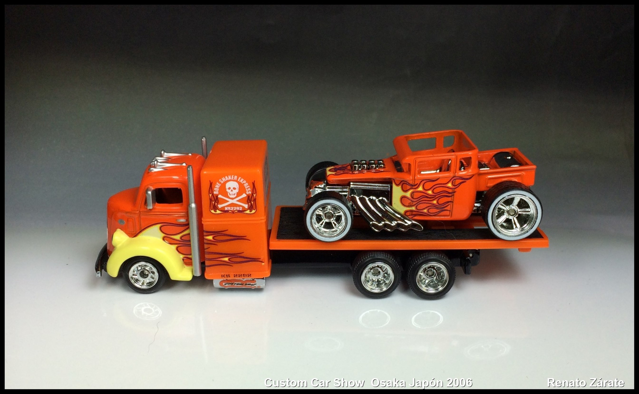 | L3525 | '38 Ford C.O.E. Truck | Orange | Yellow Flames, Skull & Cross-Bones and 'Bone Shaker Express KS2292' on Side | RR | 1,500 | 'Bone Shaker Express' 2-Car Set | ||