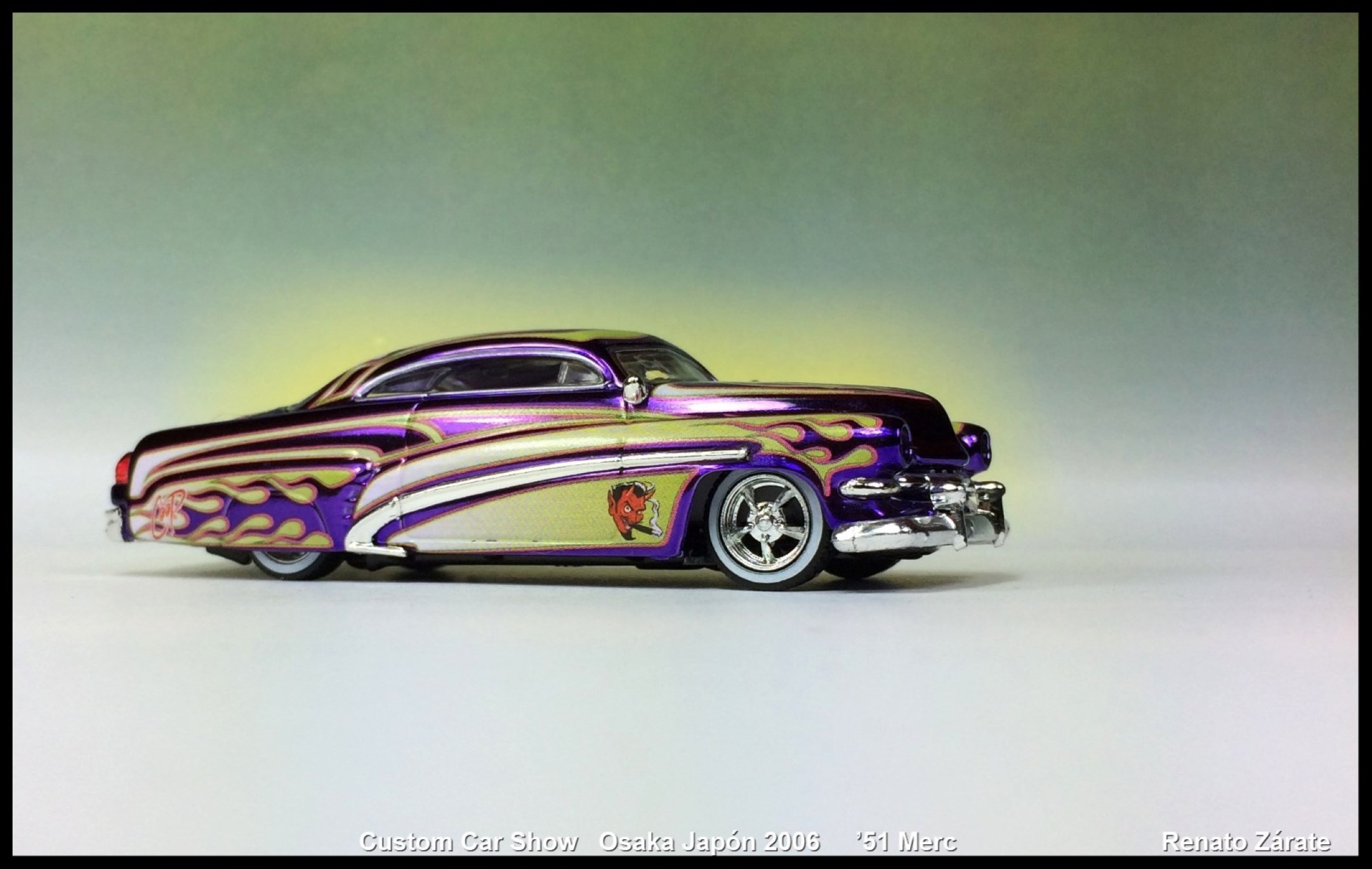 | '51 Merc | Spectraflame Purple | Light Green/White Sides and Top with Flame Cut-Outs, Logo on Trunk | White-Wall RR | |||||