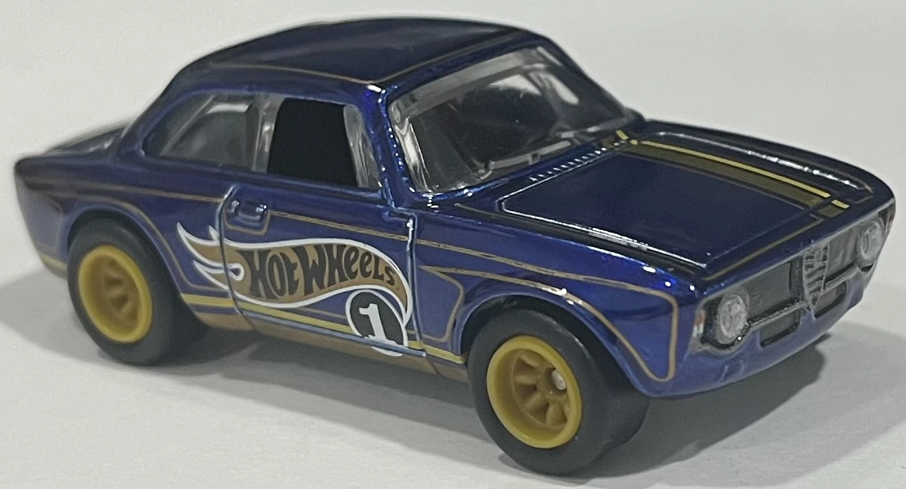 Hot Wheels logo, gold pinstriping, "1" on sides, Alfa Romeo logo on rear