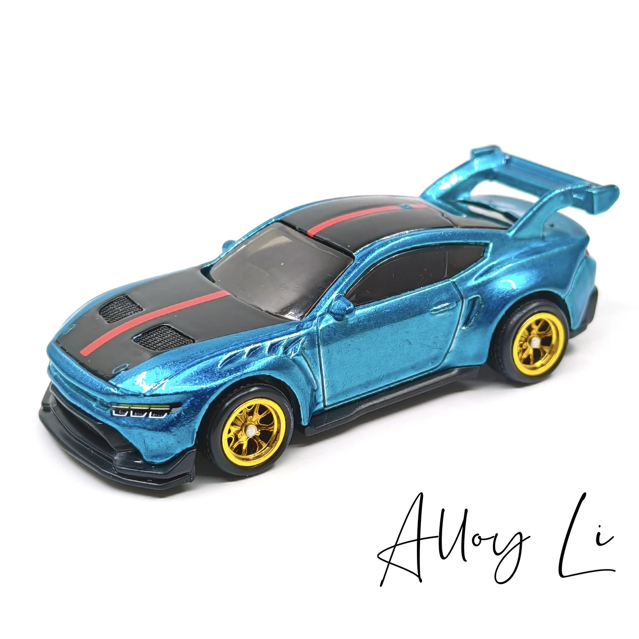 Ford Mustang GTD | Spectraflame Holographic Blue | Detailed headlights and taillights, black hood and roof with red stripe, TH rear license plate | Gray / Plastic |