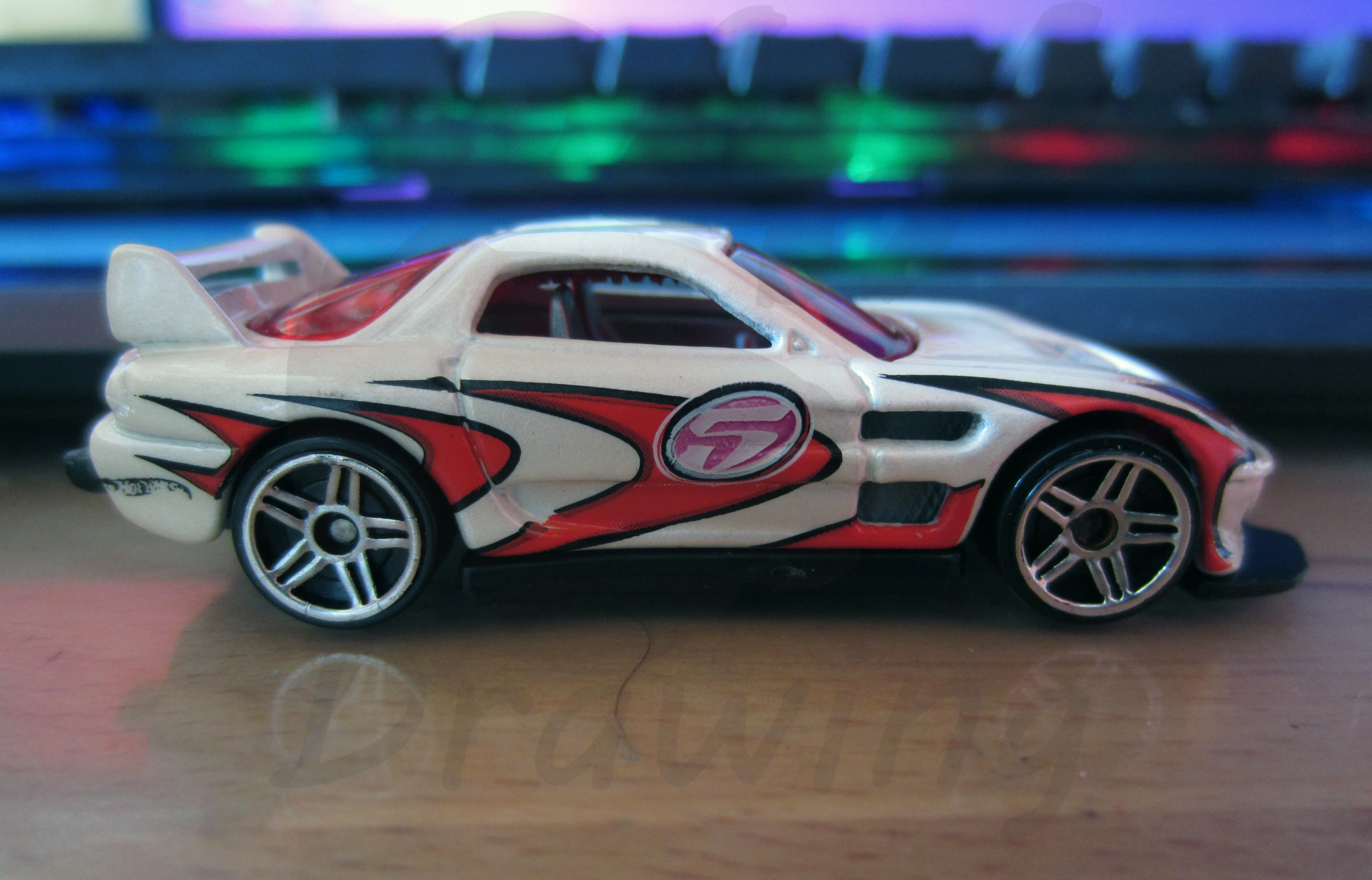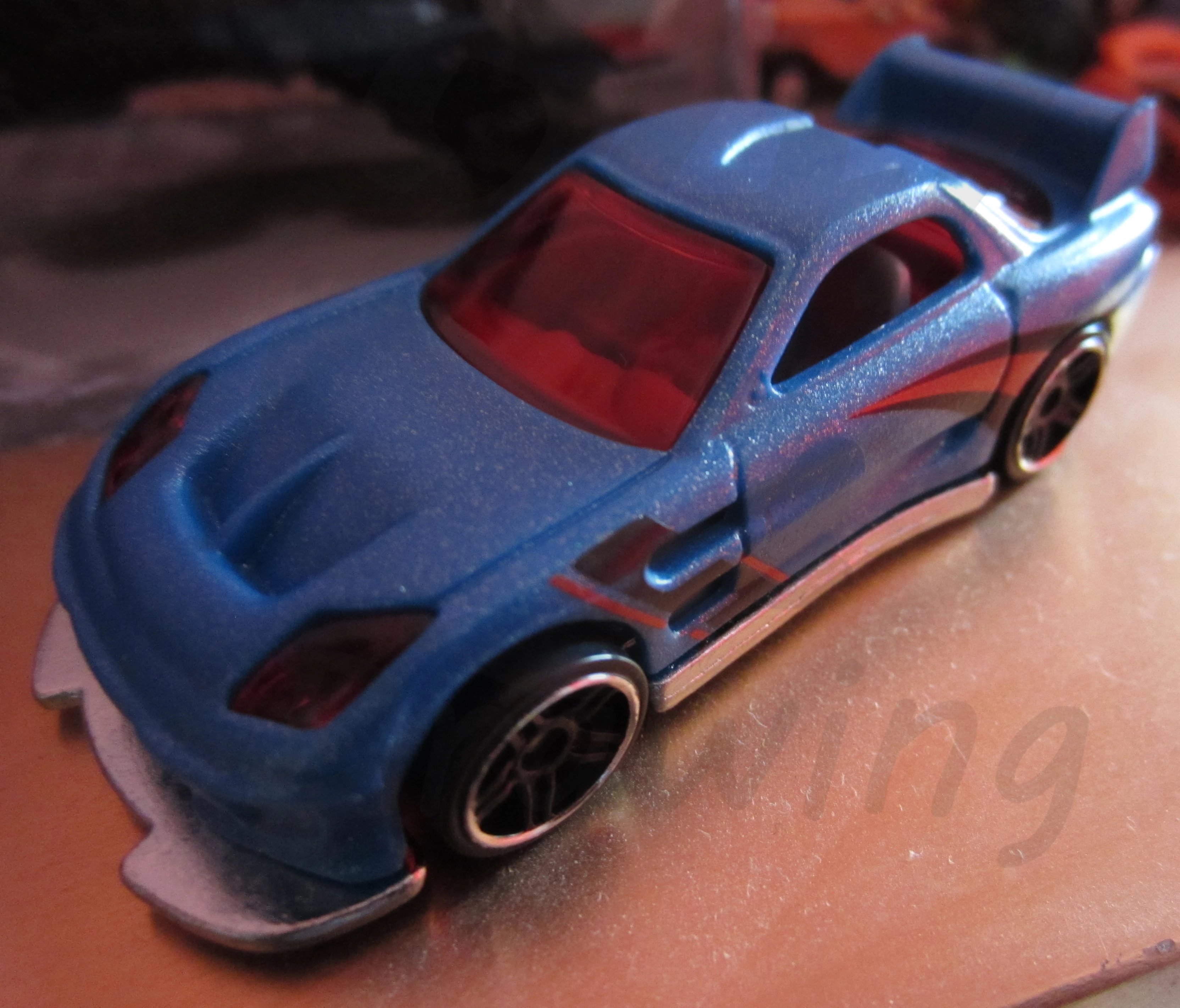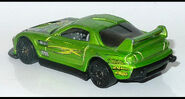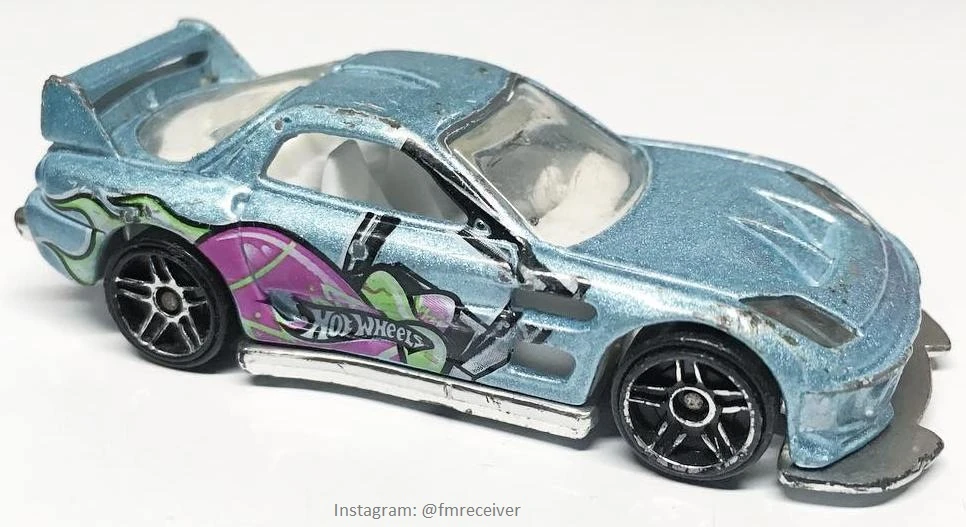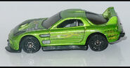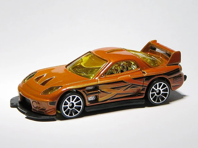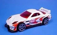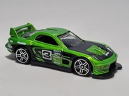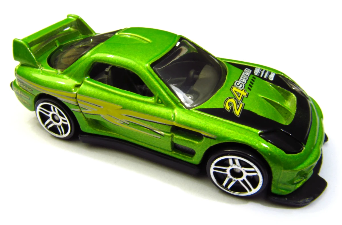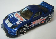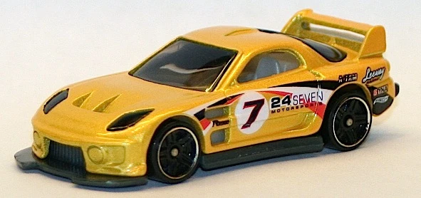 24/Seven is a tuner car resembling a third generation Mazda RX-7, with its name referencing the RX-7. This casting was one of five new models created for the teams of the Hot Wheels: World Race film; each debuted in the Mainline prior to the motion picture. In 2014, the spoiler was retooled to be closed and the post-tab design was retooled to be a post-post design.