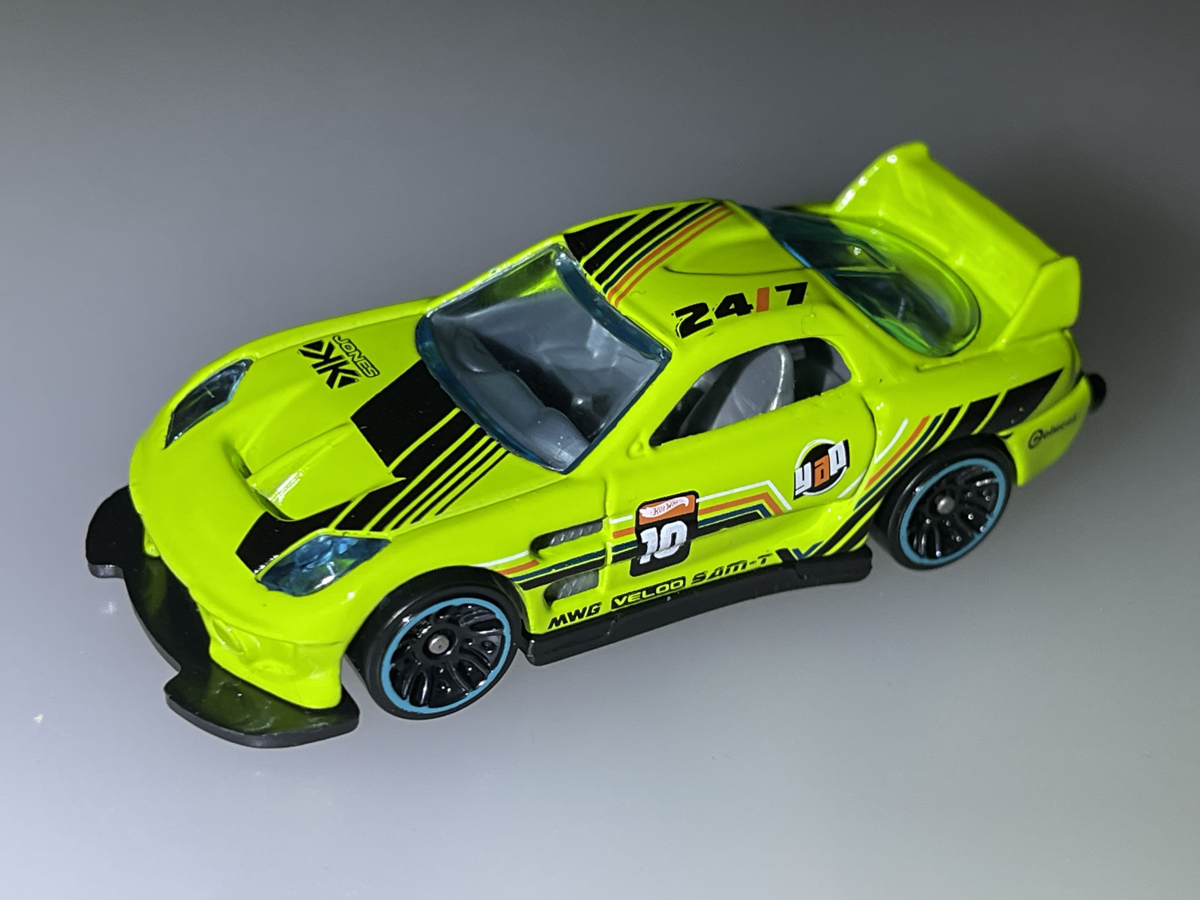 Lime Green | Black, Blue, Orange, and White stripes, "24/7" and "10" on hood, roof, and sides | Black / Plastic |