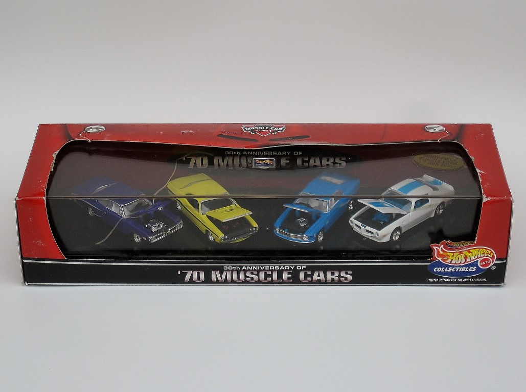 In 2000, 100% Hot Wheels celebrated the 30th Anniversary of 1970 Muscle cars by releasing this 4-Car set, featuring four brand new castings all highly detailed with rubber wheels and opening hoods.