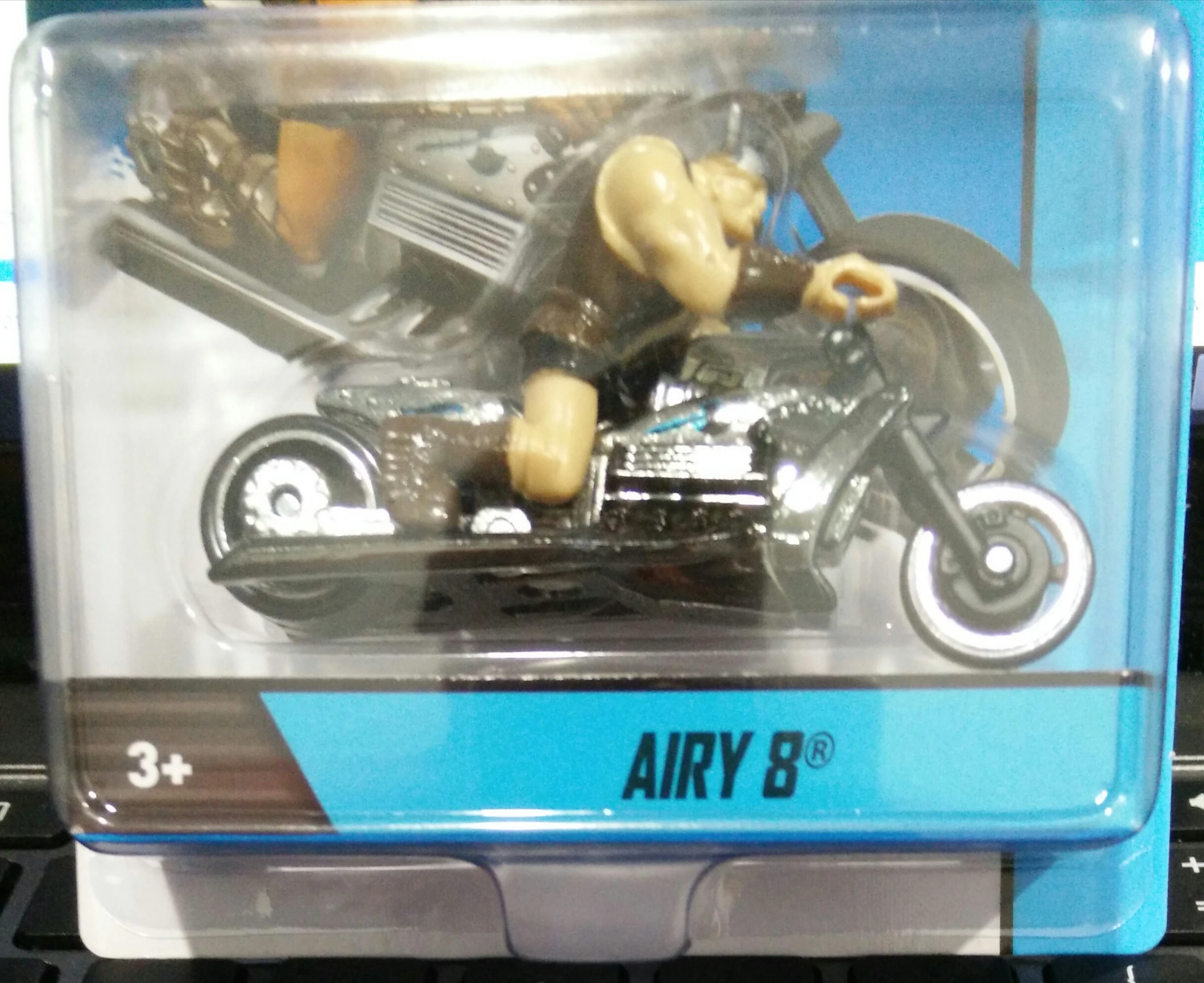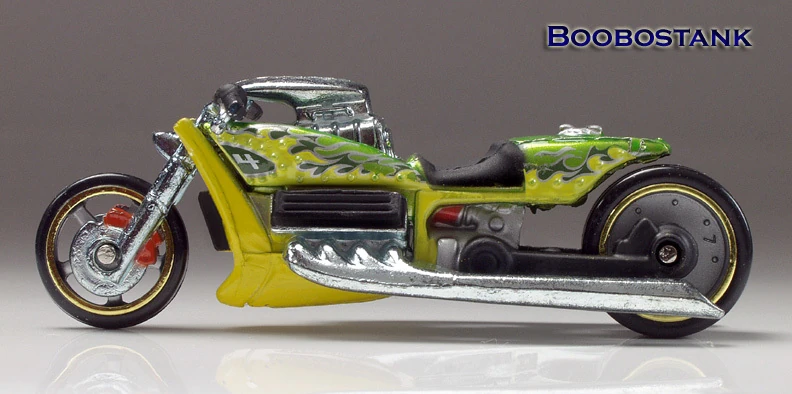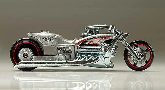 Airy 8 (conceptualized as Jaw Jammer) is an original design by Phil Riehlman that debuted under the First Editions: Realistix segment of the Mainline in 2005. This casting was originally planned to have debuted under the Metal Maniacs subset of the AcceleRacers series in 2005, but was cut due to its focus on track performance. It depicts a muscle motorcycle with 540 HP, a blown 5 liter V8 engine, aluminum frame, titanium oil/heat exchange, a 17” front and a 20” drag slick back wheel.