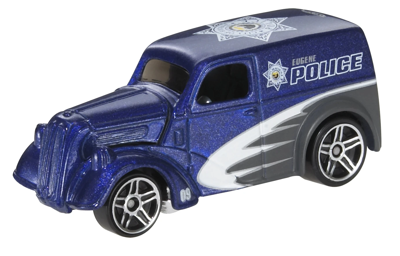 Metalflake Blue | White, Gray, Silver and Yellow tampos, 'Eugene Police' on sides and roof | Chrome / Plastic |