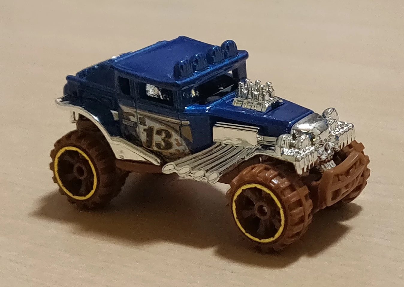 | 090/250 | 2013 | HW Stunt: Desert Force | Metalflake Blue | Brown mud splashes & Black & White weathered pirate flag (skull & crossbones) | Black / Plastic |