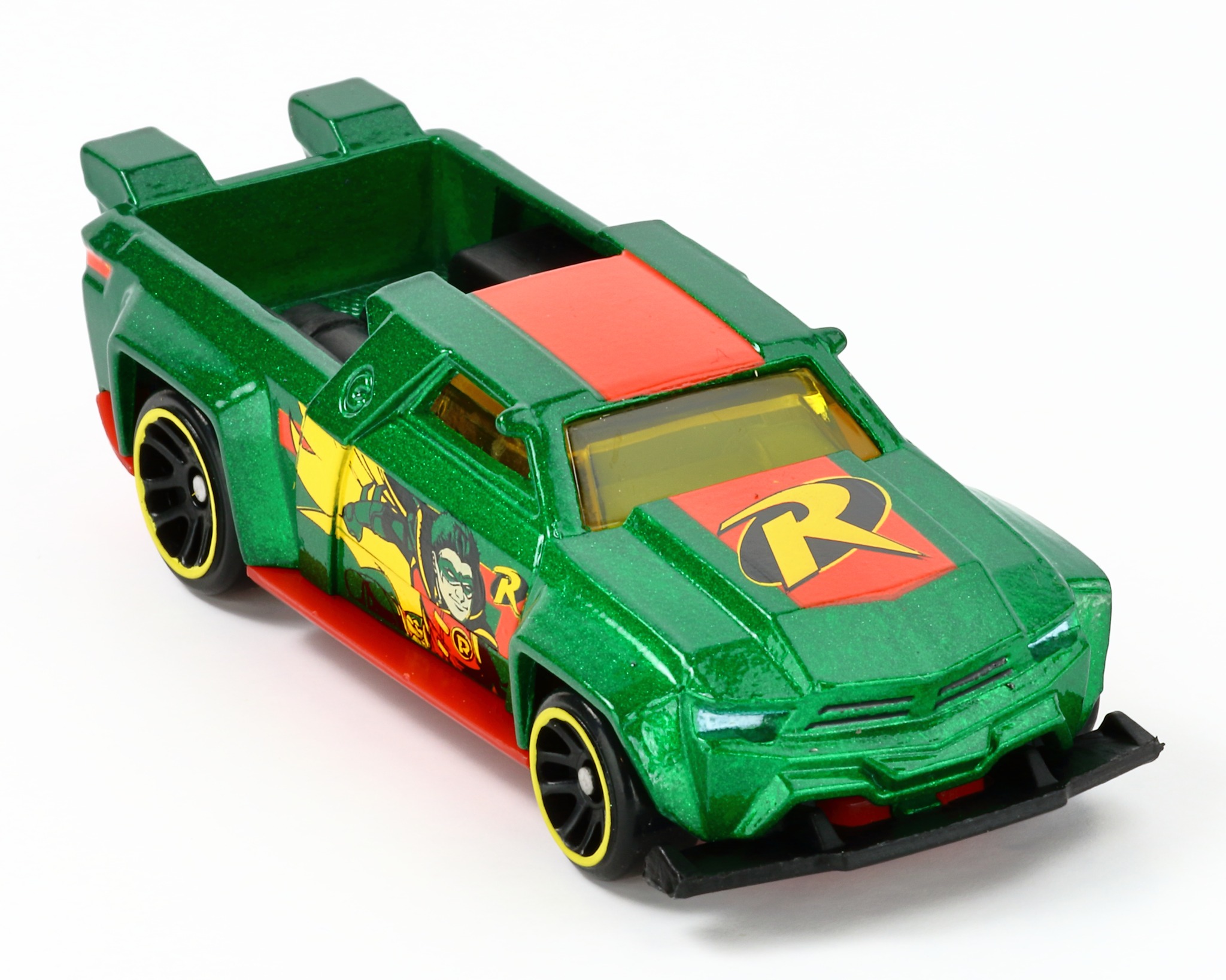 | Solid Muscle | Green | Robin in Red Costume with Yellow Cape and Italic "R" logo on both doors, Robin smiling on passenger side door, DC copyright driver's side door. White headlights, Red side taillights, Wide Red stripe on roof and hood, R logo on hood | Red / Plastic |