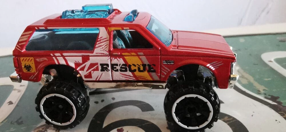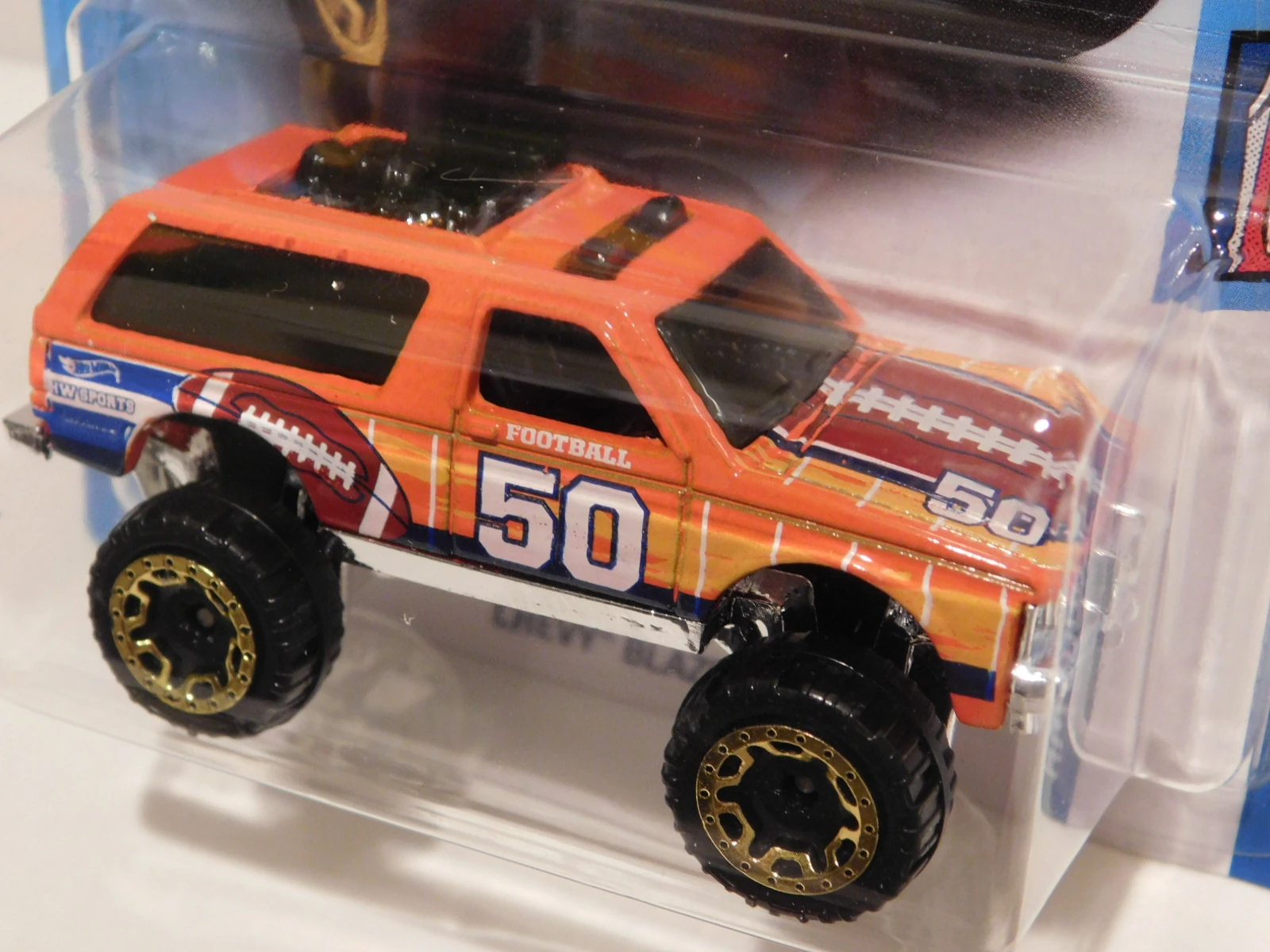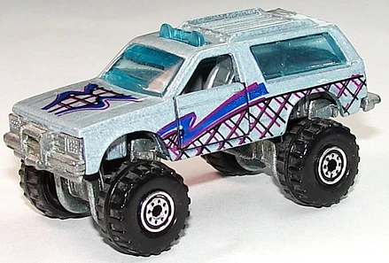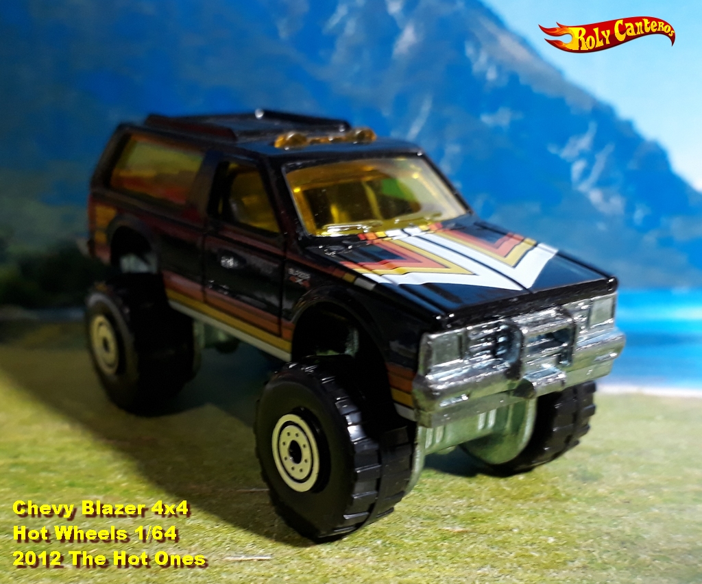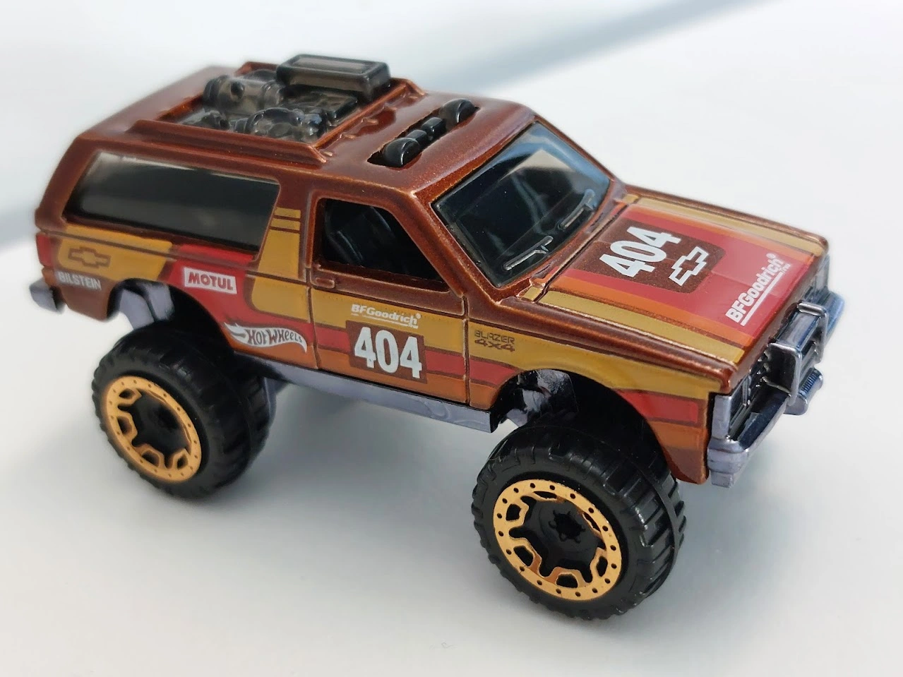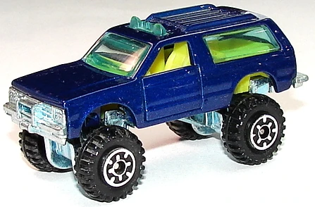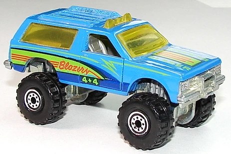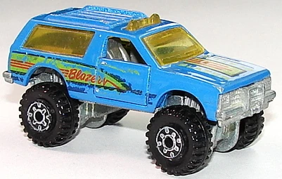 Black | Detailed headlights, taillights and trim; Hot Wheels logo, Blazer 4x4 emblem, and blue side paneling with silver stripes on sides; blue stripes on hood; belltech logo on rear window | ZAMAC | Smoke tint | Black | ORST | HRR96 | Malaysia | Base code(s): T06, T07 |