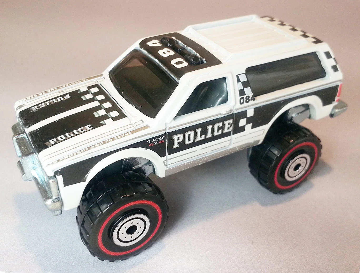 White | Police tampos on sides & hood | ZAMAC | Smoke tint | Grey | Red Line CT | CFN85 | Malaysia | Named Chevy Blazer 4x4 Base code(s): H49, H50, J04 |