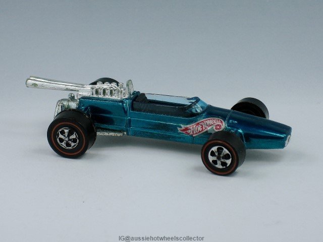 | 1969 | Grand Prix | Spectraflame Aqua | Hot Wheels Flame right Side on Body | Metal | Blue tint | Black | RL | 6264 | HK |