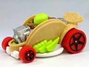 Car-de-Asada is a motorized taco on wheels, with two nacho chips for a spoiler, two lime wedges on each sides of the body, and a bowl of guacamole (or salsa, depending on the color) dip for the engine bay. The driver, fuel tank, and the engine appears to be peeking out from the taco filling, while the exhaust pipes come out from the sides of the taco. The base appears to depict a paper plate.