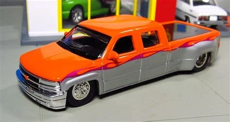 Let's face it, the most eye-catching pickups on the road have been slammed and are cruisin' on glistening chrome wheels - BIG BODACIOUS WHEELS! Low-ridin' dubs have become wildly popular with everyone from sports and rap stars to to upscale urbanites. They have been an important part of custom car culture. Our Chevy crew cab truck fits the culture to a 'T' and offers a great deal on some big wheels ... in 1:64 scale.