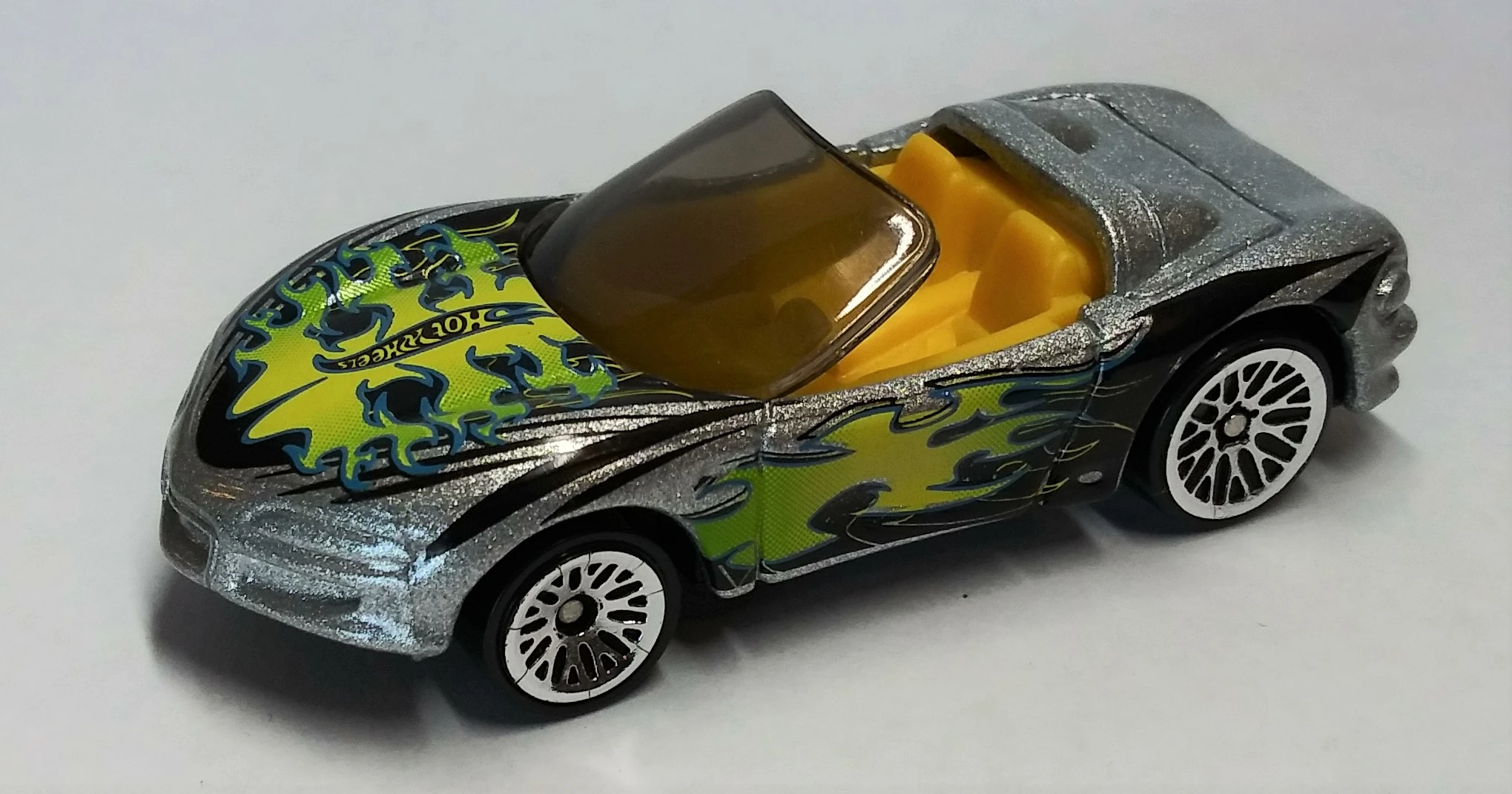 | 180 | 2001 | Mainline | Silver | Green, Yellow, Blue, & Black Flames Graphics on Sides & Hood. Hot Wheels Logo on the Hood. | Black / Plastic |