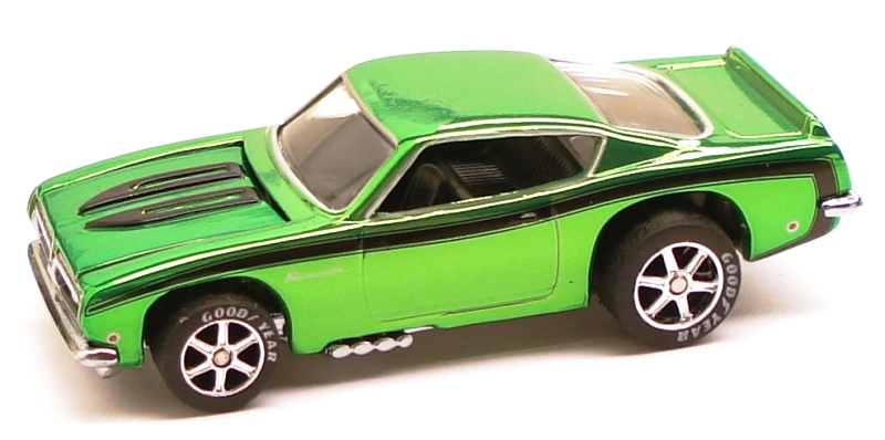 Spectraflame Light Green | Black stripe on sides and hood, "Barracuda" on sides, silver trim, painted headlights, side marker lights, & taillights | Chrome / Metal |
