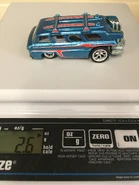 Hot Wheels has taken the basic van, lowered and "raked" it by making the rear wheels larger than the front wheels, giving the body a forward slant. Hot Wheels also fitted a huge boxer engine in the back that is molded into the base piece. Cast into the roof are two surfboards fitted on a roof rack and the interior features a roll cage.