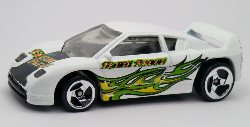 | Zender Fact 4 | White | Yellow & green flames, "FLAME PROOF", Hot Wheels logo | Black / Plastic |