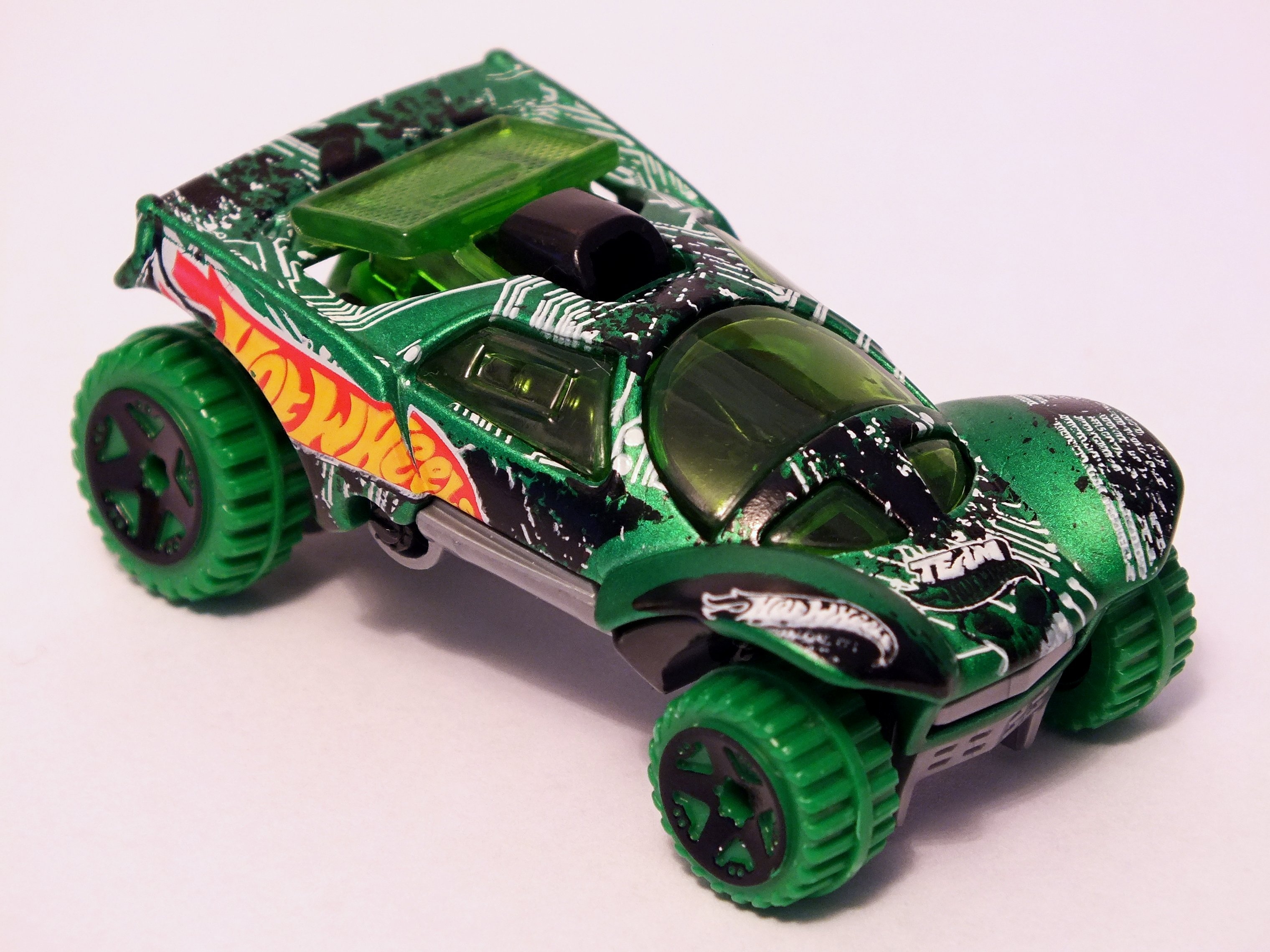 2013 | HW Stunt: Desert Force | Dark Green Satin | Team Hot Wheels Tampos and Hot Wheels logo on sides | Grey / Plastic | Dark Green tint | Black | Green tires, Black OR5SP | X1730 | Malaysia | Base Code(s): E36, E37 |