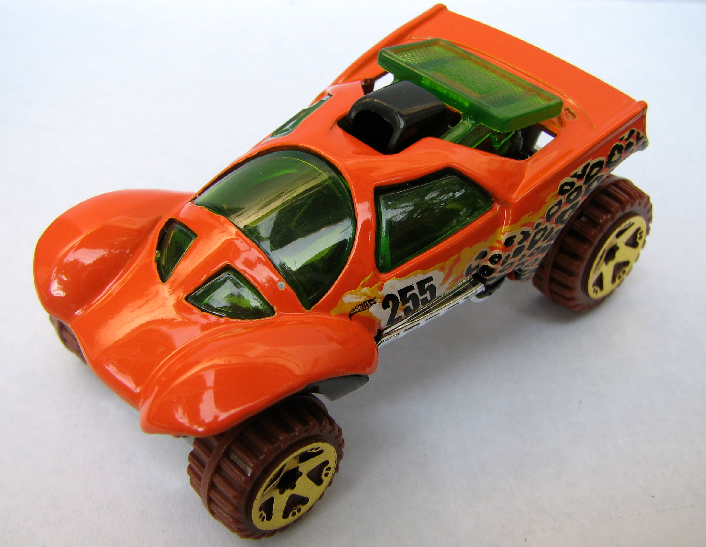Orange | Yellow, Black and Tan leopard racing deco, "255" | Chrome / Plastic | Green tint | Black | Brown tires, Chrome Gold OR5SP | T9919 | Malaysia | Base Code(s): D12, D21, D23 | |