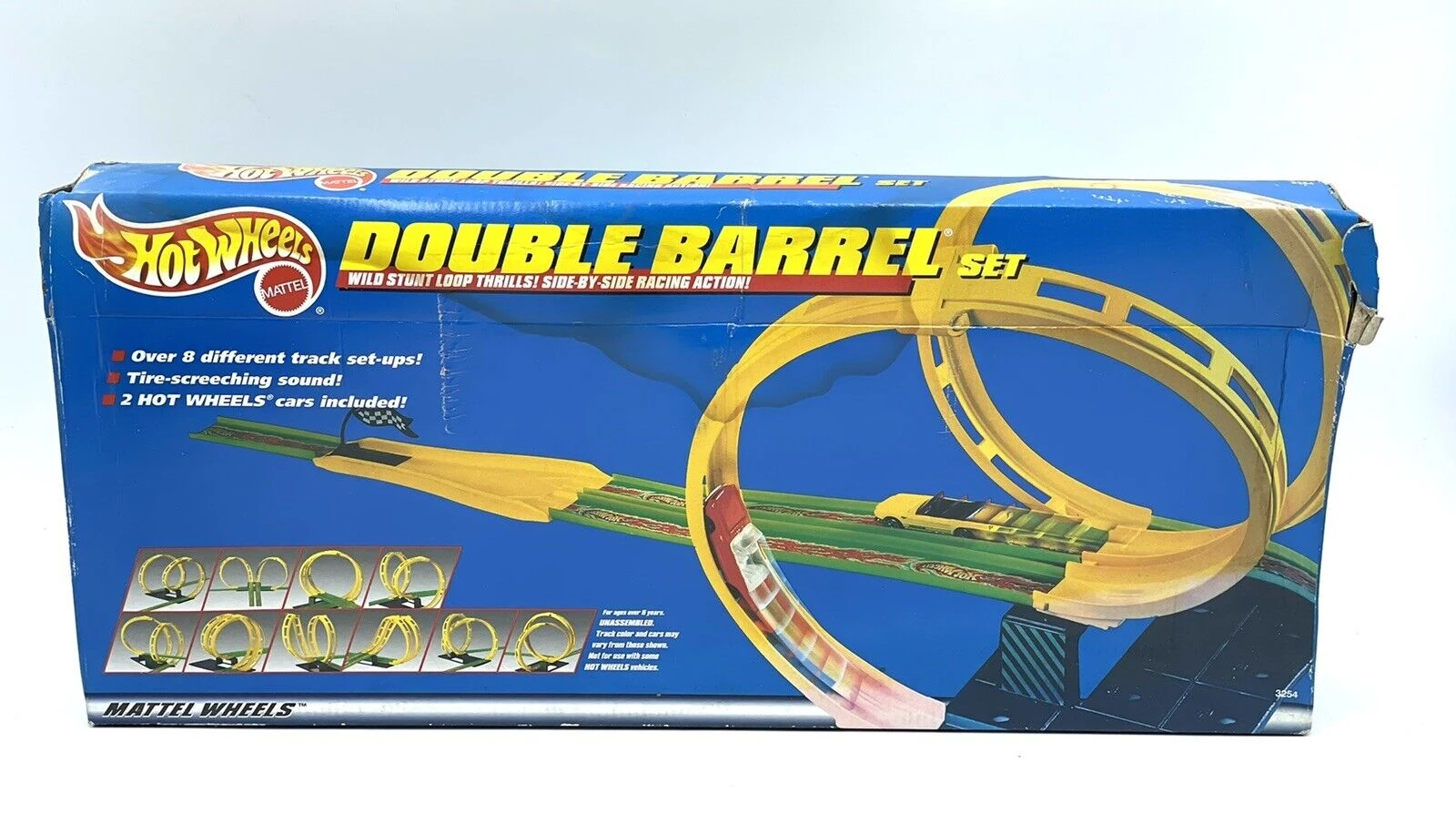 Double Barrel Set is the name of many Track sets that have been used in various years. As the name suggests, these tracks test the limits of Hot Wheel cars by racing an opponent by racing through a loop and passing the finish line first. The Sets are the same through the years with certain differences within the years.