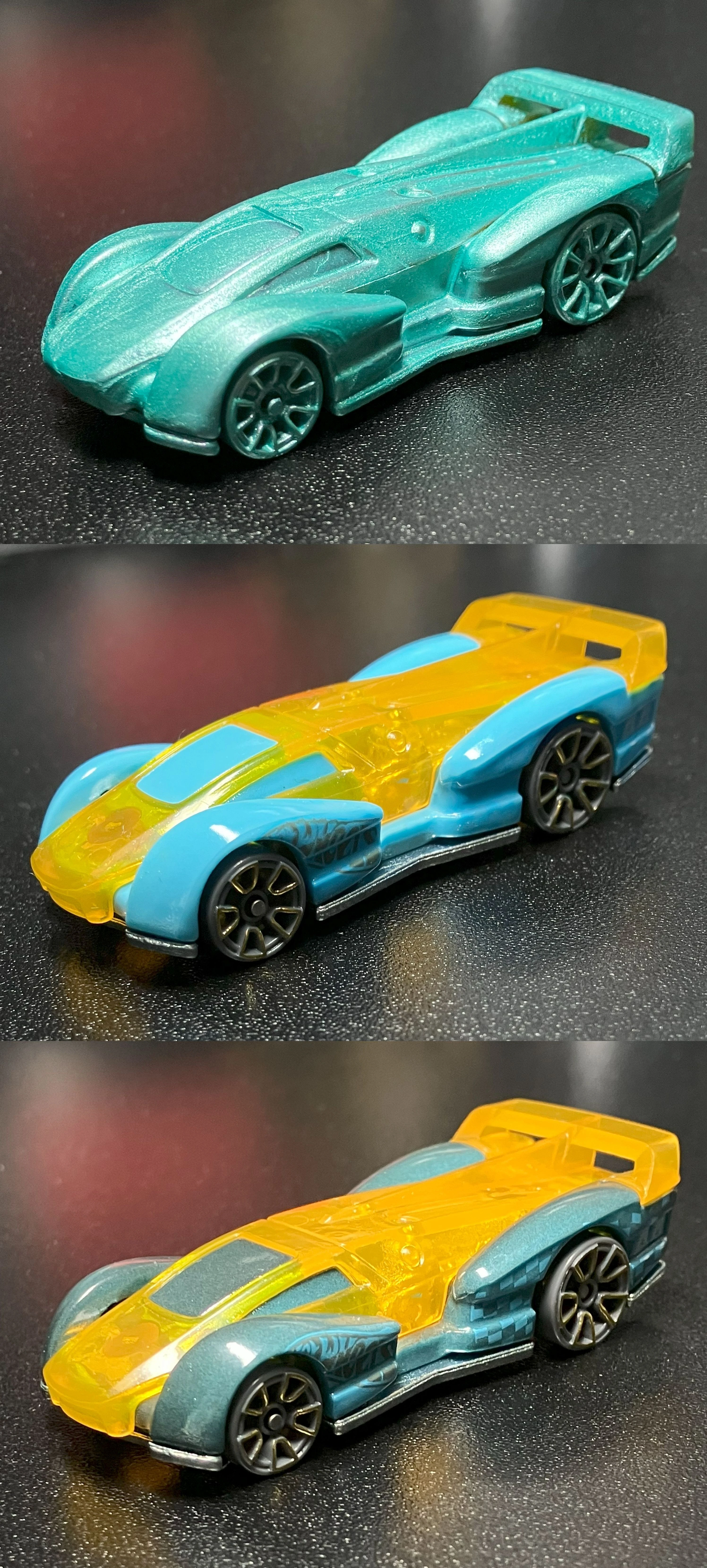 | 2024 | X-Raycers 5-Pack | Transparent blue | Green and white stripes on sides, "4", "X" on sides, green Hot Wheels logos on sides | Yellow / Metal |