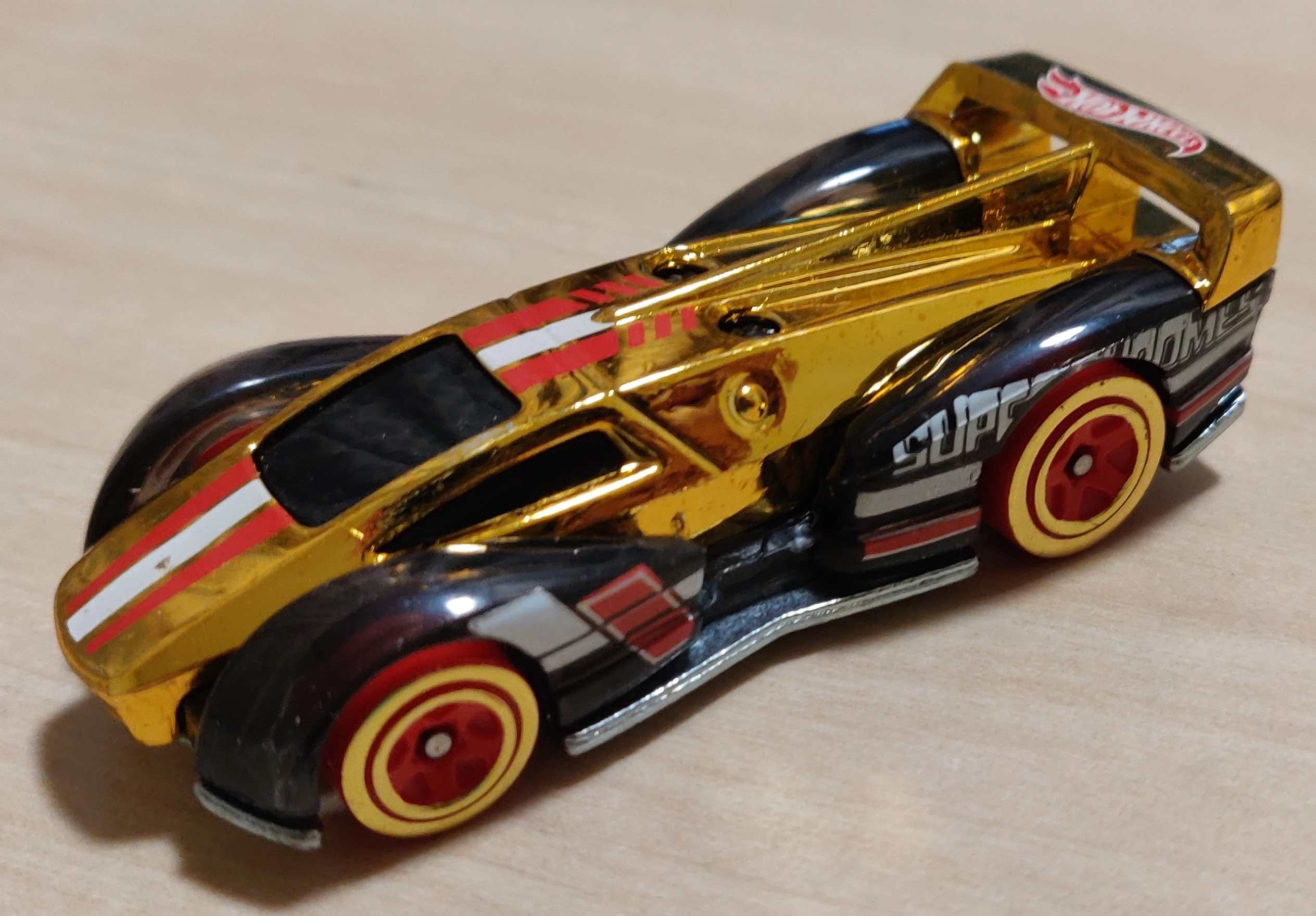 Chrome Gold over Clear Black | White & Red stripes on top & sides, 'Super Chromes' on rear fenders, HW logo on spoiler | Unpainted / Metal |