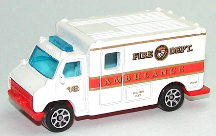 | Ambulance | White | Red, Black, Gold "Fire Dept." "AMBULANCE" "18" | Red / Plastic | Blue tint | White | SB | Malaysia |