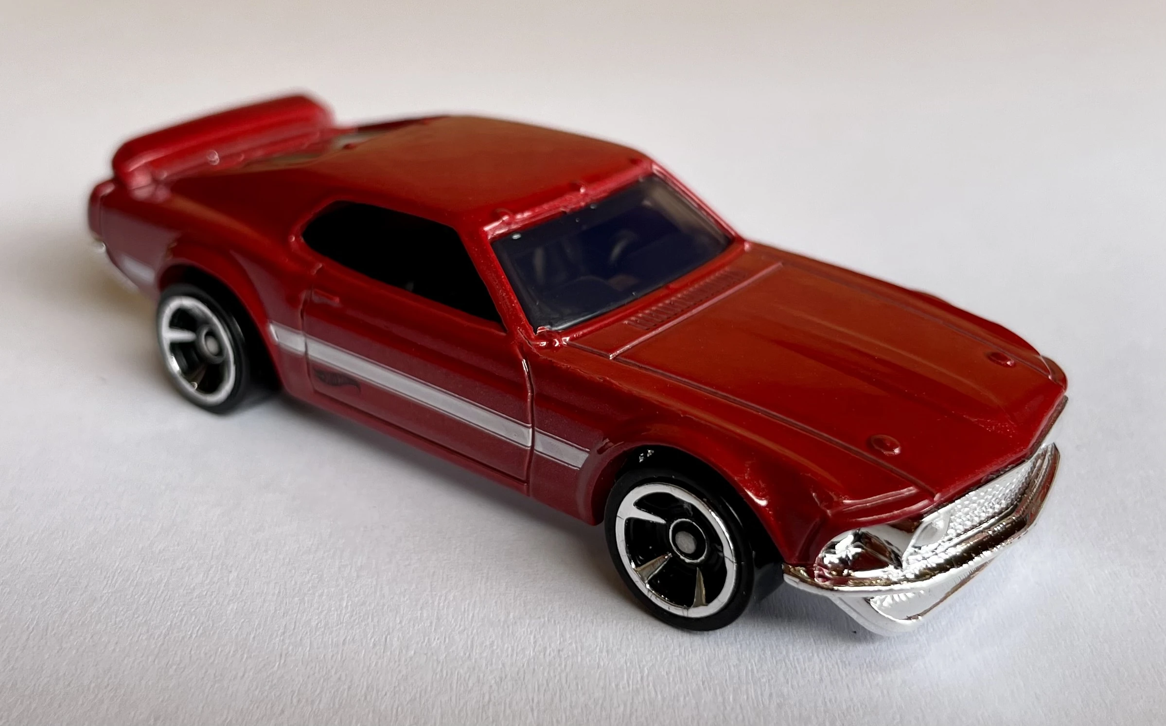| '69 Ford Mustang Boss 302 | Metalflake Crimson | White stripe and black Hot Wheels logo on sides | Black / Plastic |