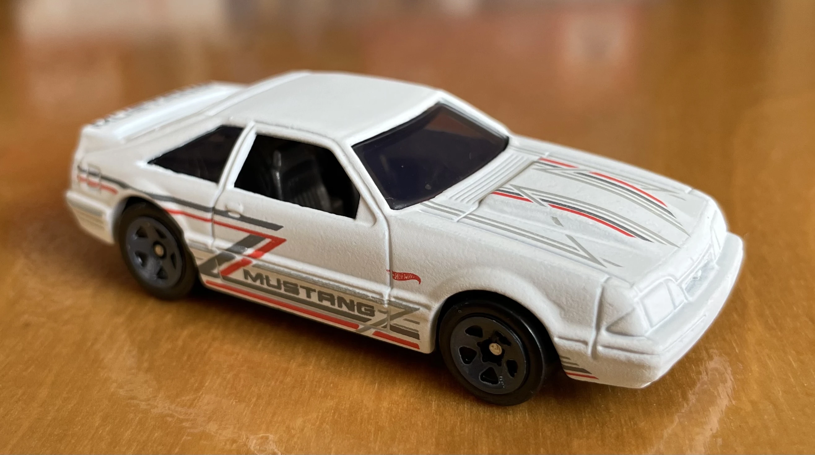 | '92 Ford Mustang | Matte white | Red and silver stripes on hood and sides, "Mustang" on doors and spolier, red Hot Wheels logo | Black / Plastic |