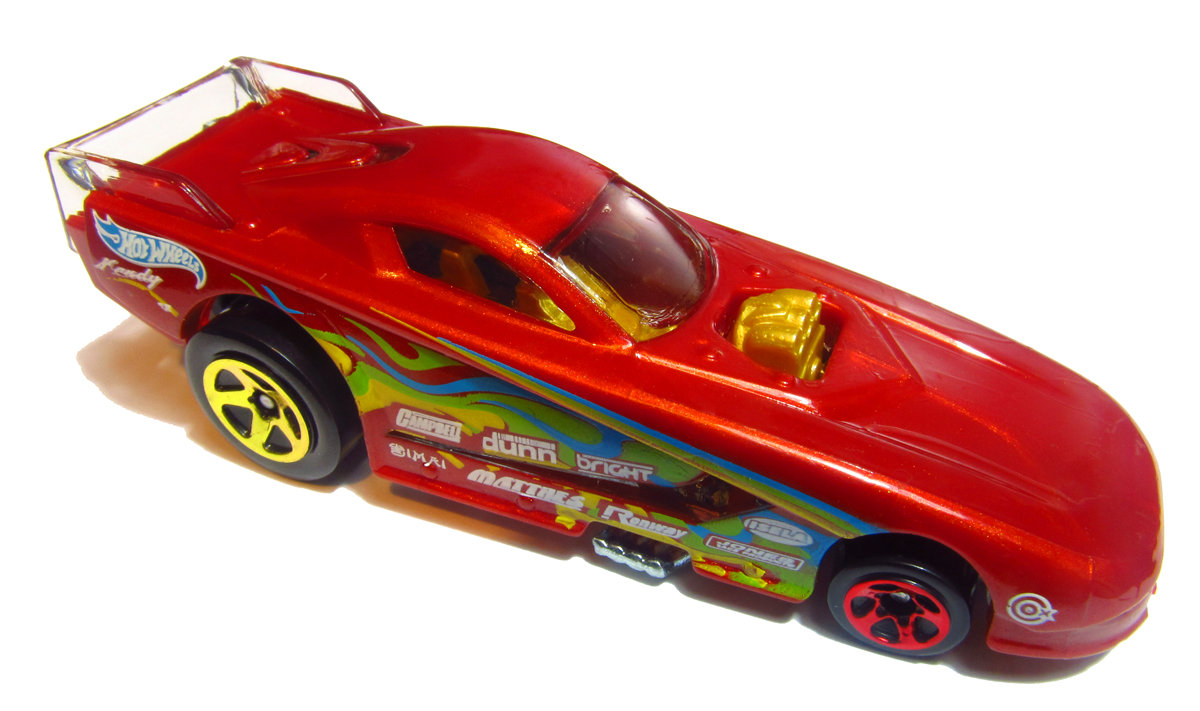 Funny Side Up is a futuristic funny car. This casting features a co-molded body to provide numerous different color breaks on the casting. The base of the casting is heavily based on that of the Mustang Funny Car, as well as the interior: both bases however are incompatible.