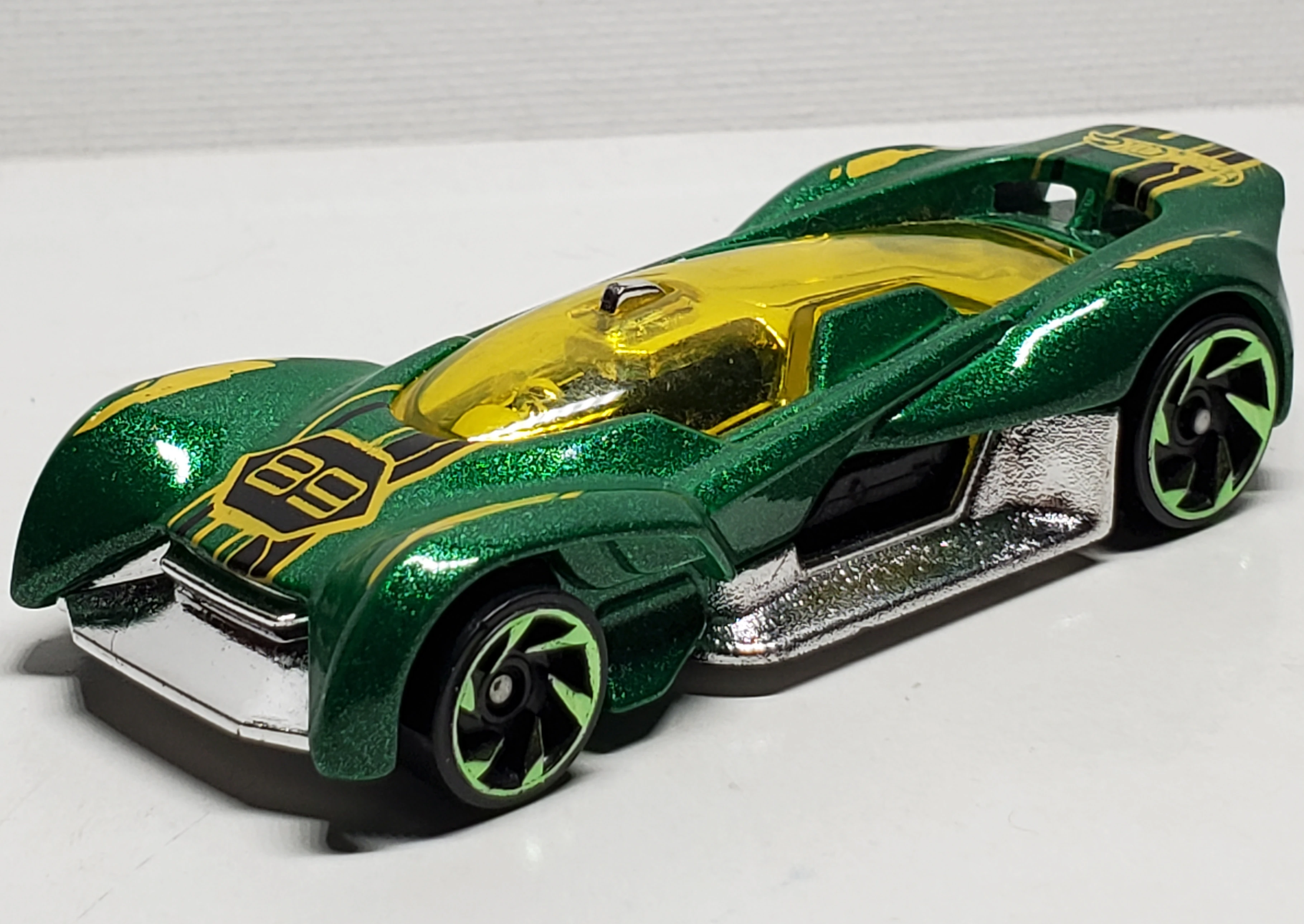 Metalflake Green | '89' on hood, Black & Yellow stripes on top, HW logo on rear | Black / Plastic |