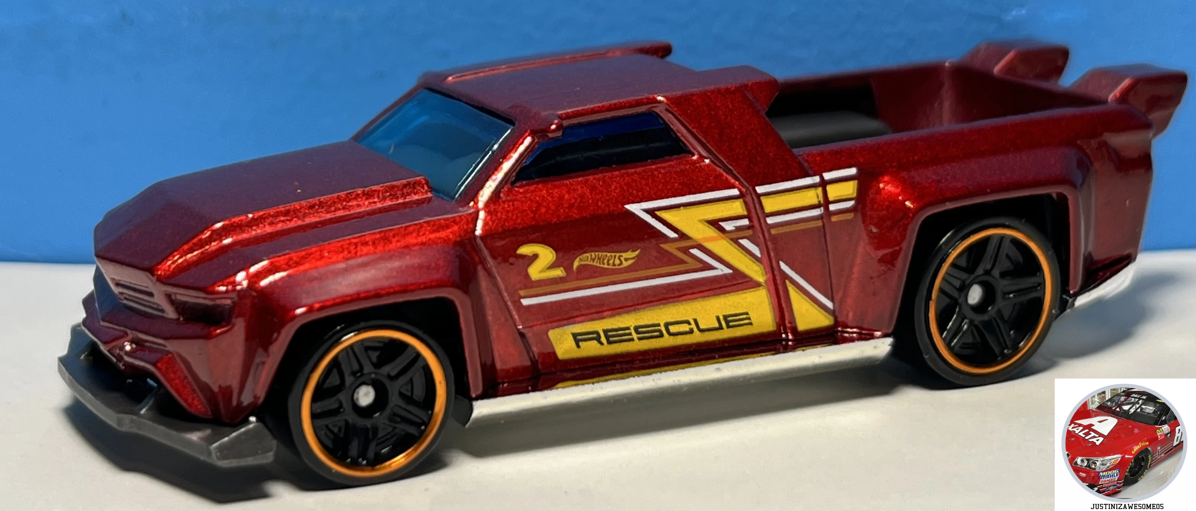 | Solid Muscle | Red | Yellow and white stripes, "RESCUE", "2", Hot Wheels logo on sides | Chrome / Plastic |