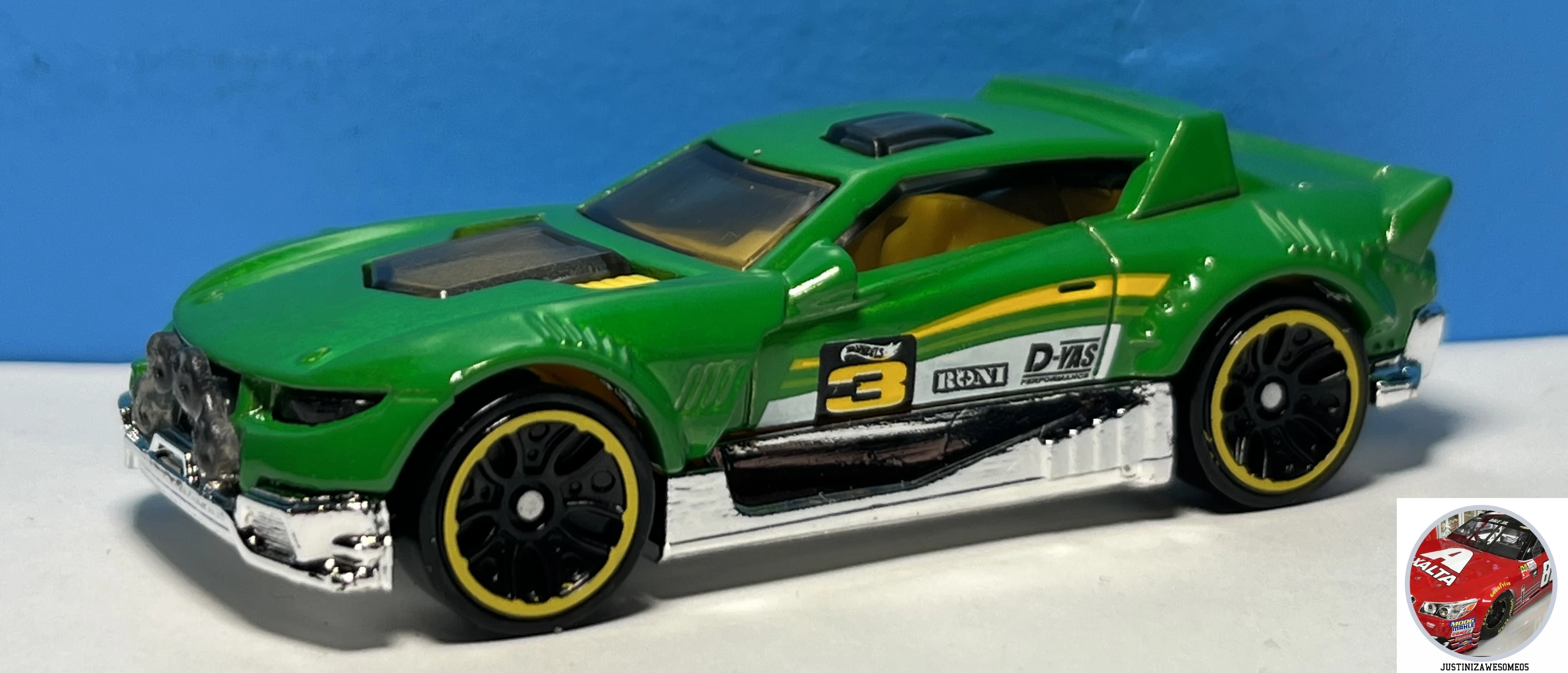| Rally Cat | Green | Yellow and white stripes on doors, Hot Wheels logo, "3", "RONI", "D-YAS" on sides | Chrome / Plastic |