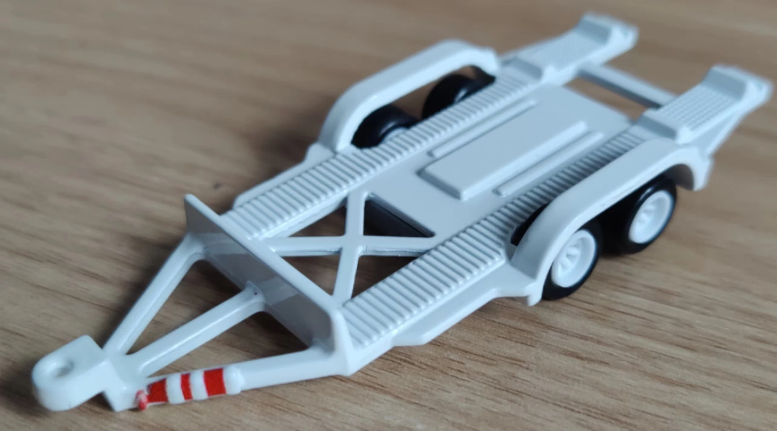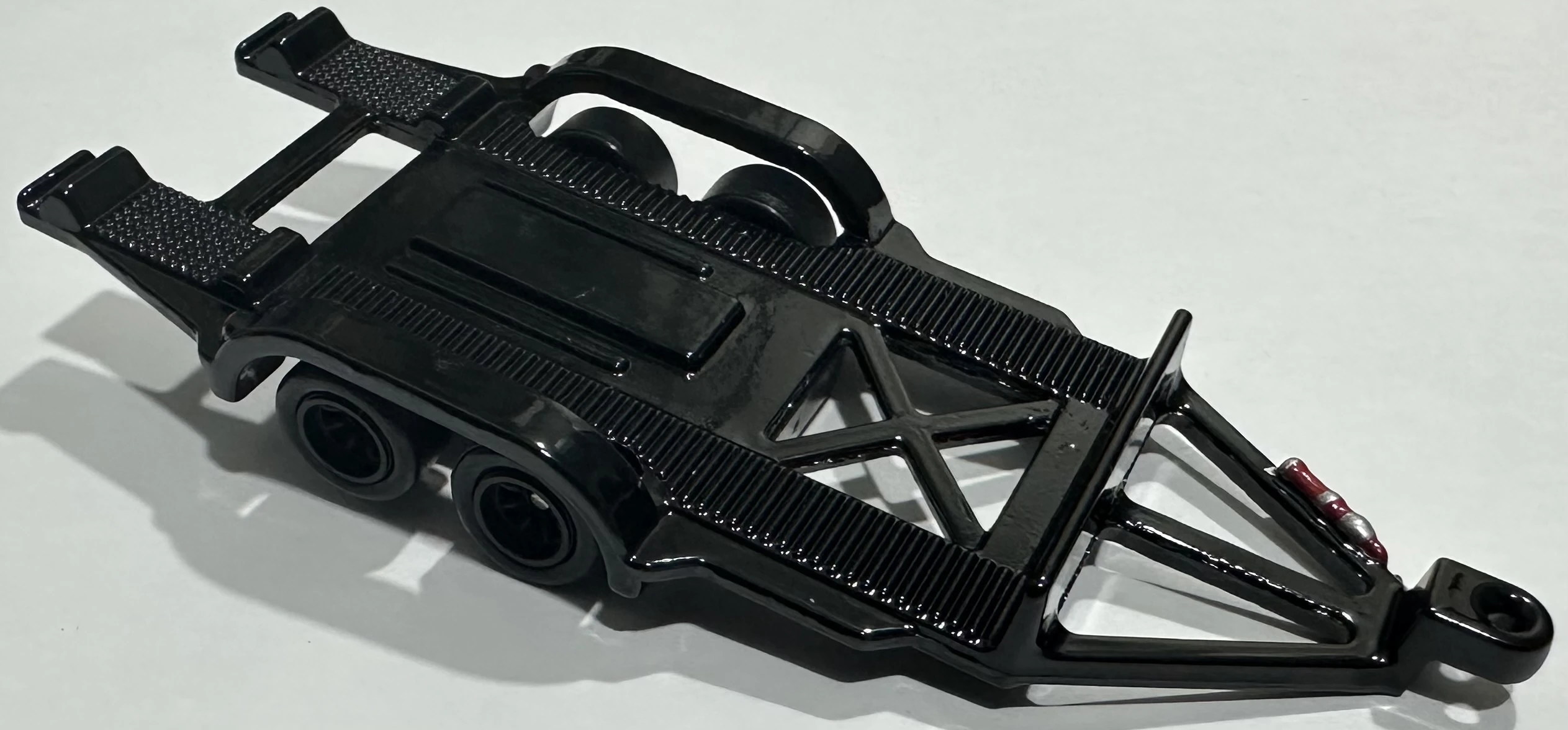 This casting will always be packaged with another vehicle with a hitch; it was initially named Rally Trailer for its first release. Since 2022 this casting was given narrower fenders to allow it to carry wider vehicles.