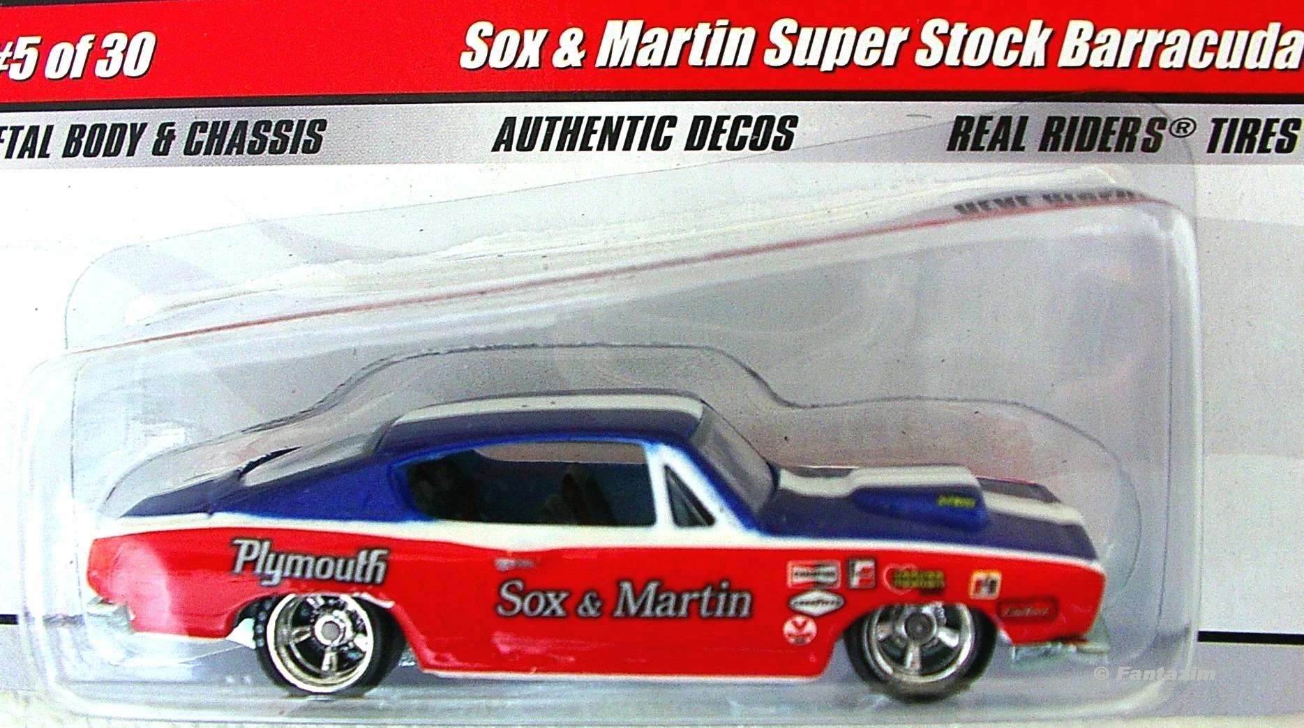 Pearl White, Metalflake Dark Blue, and Red color | Black, Silver & Yellow graphics, Black and Silver "Plymouth", and "Sox and Martin" on sides with racing deco, and Yellow "'Lil Boss" on hood shaker | ZAMAC | Clear | Black | Goodyear RRMag | N8964 | Thailand | Named Sox & Martin Super Stock Barracuda Base code(s): |