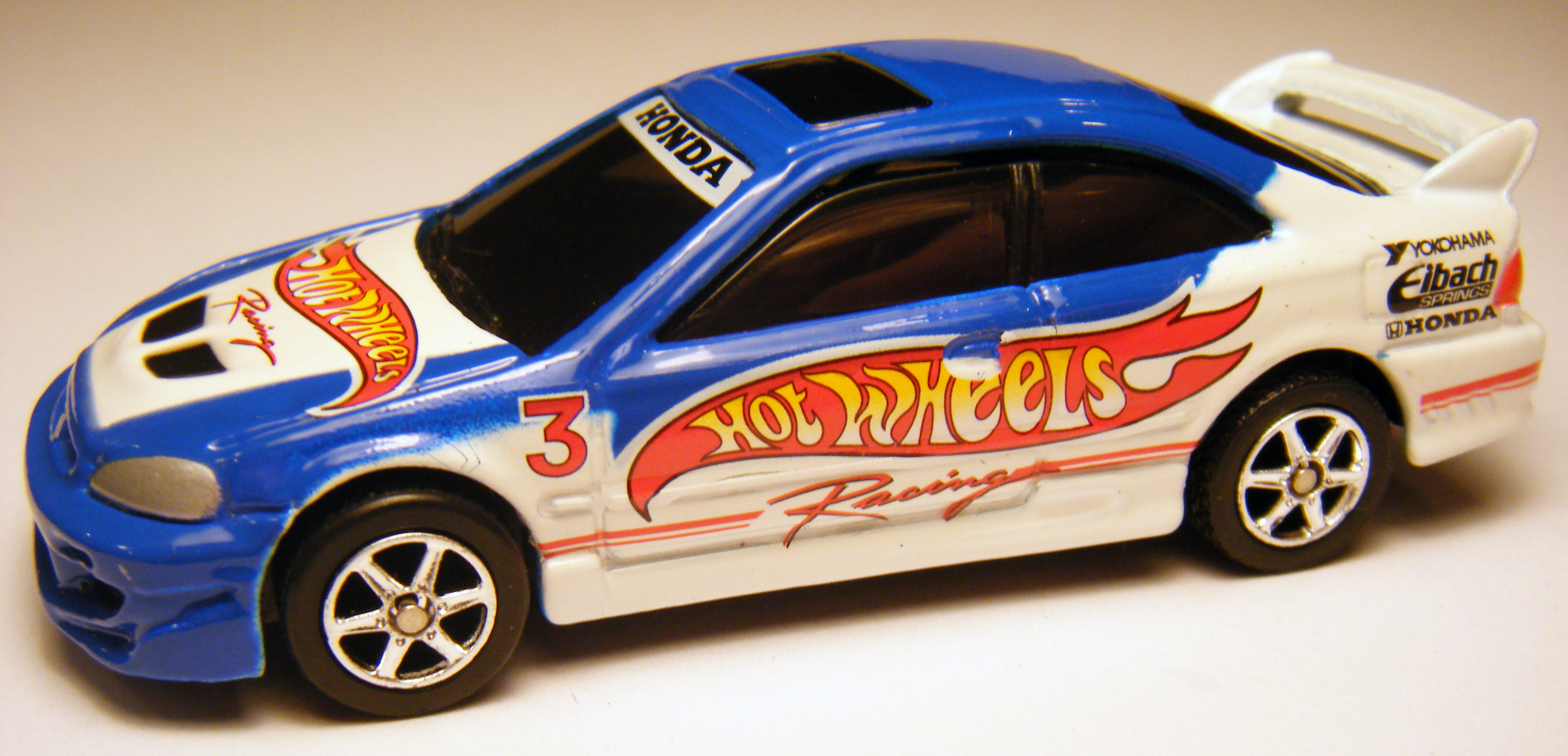 White | Black hood; Honda symbol & "CIVIC" on rear; Hot Wheels logo on rear license plate; painted headlights & taillights | Black / Plastic |