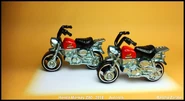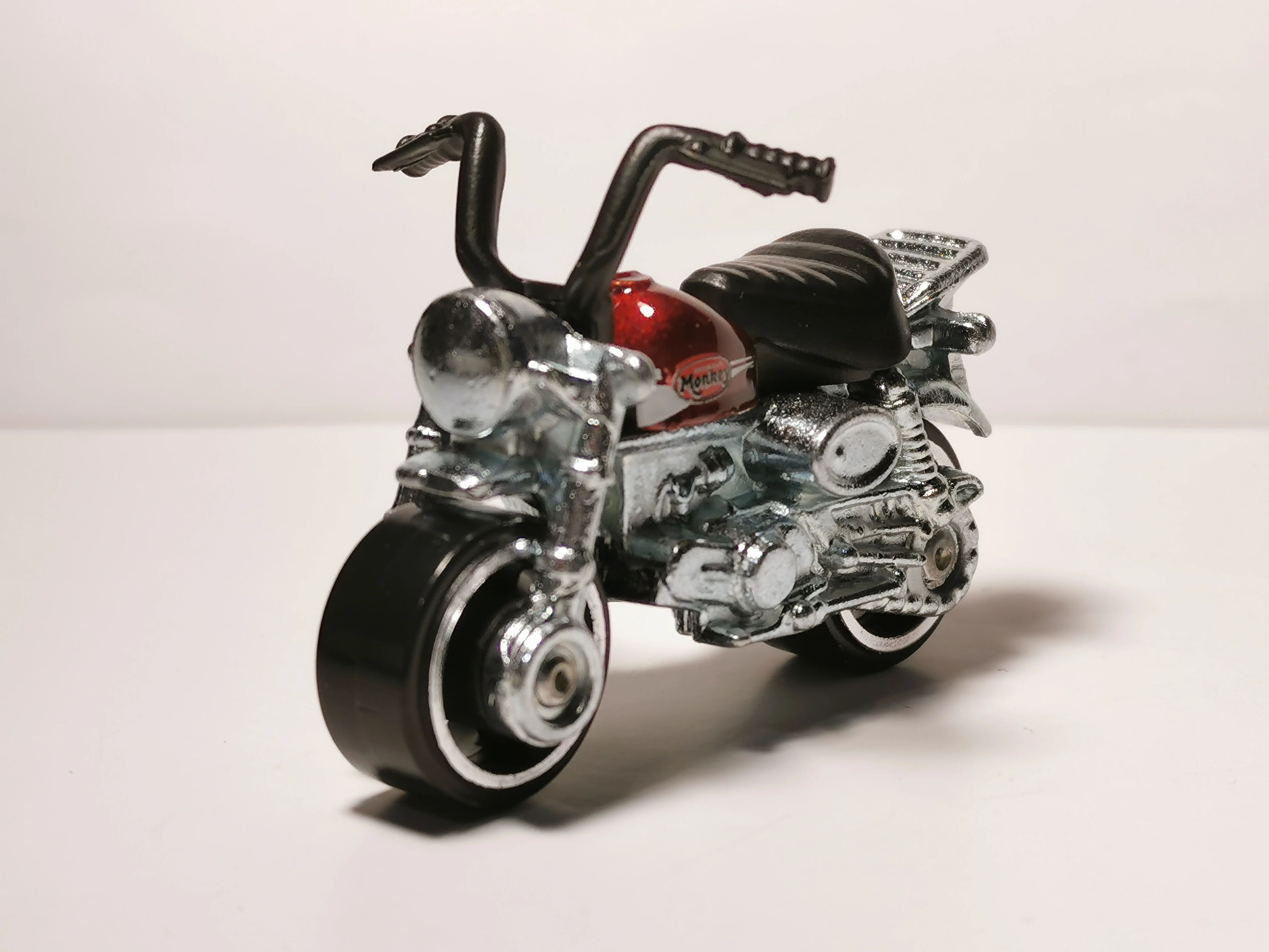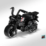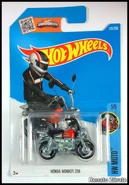 The Honda Monkey Z50 is a casting of the iconic Honda Z50 Motorbike produced from the mid 1960s, due to be discontinued in late summer of 2017. The model consists of an unpainted metal base, plastic handlebars, and seat as one piece and a painted metal piece for the fuel tank. The tank acts as a pin, holding the plastic seat and handlebar piece onto the base. The nickname 'Monkey' used in the casting name is derived from the position riders take on while holding the handle bars, which resembles a gorilla or ape using it's arms to stay propped upright. This casting is the oldest model of Japanese origin produced by Hot Wheels as of 2017.