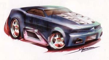 Horseplay is a depiction of a slightly futuristic Tooned-style muscle car with giant side exhausts.